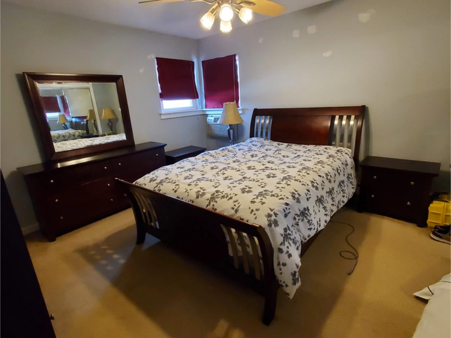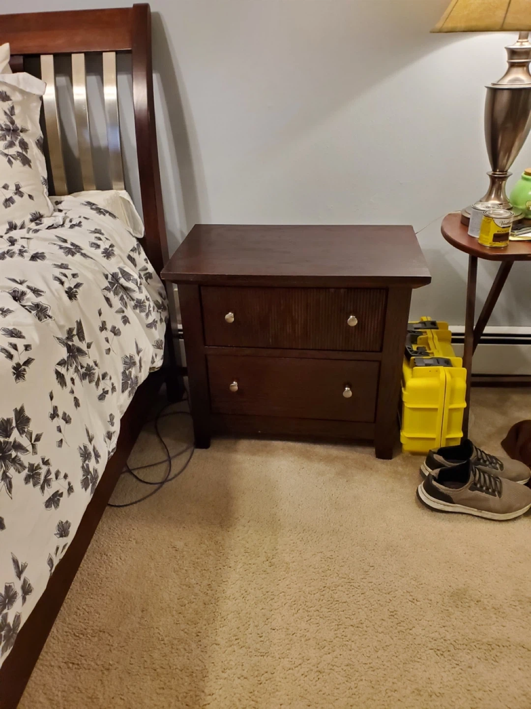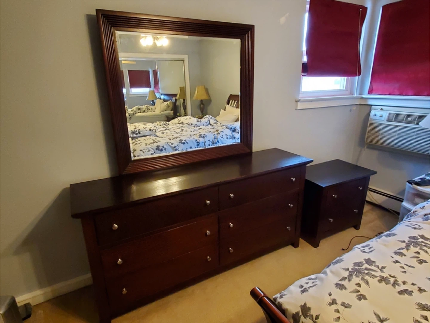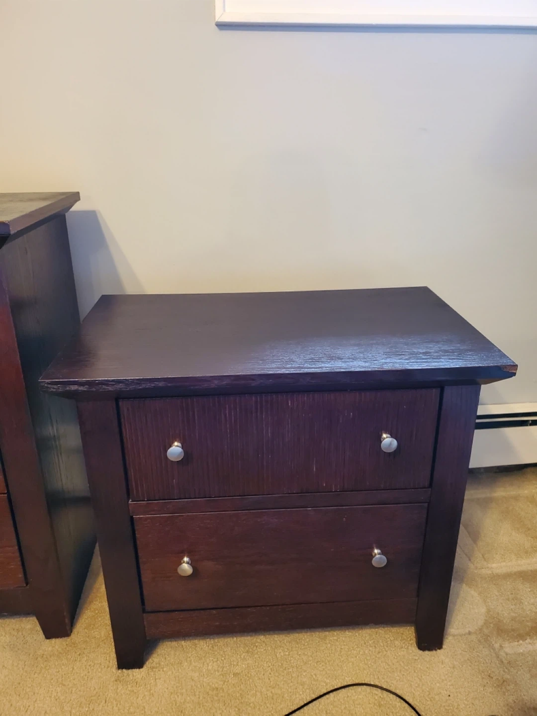 Selling complete 6 piece solid dark brown wood bedroom set up for grabs. Includes a bed frame, dresser with mirror, two nightstands, and a tall armoire. Dresser has 6 drawers. Each nightstand has 2 drawers. Armoire has 2 doors and 3 drawers. Lots of storage.