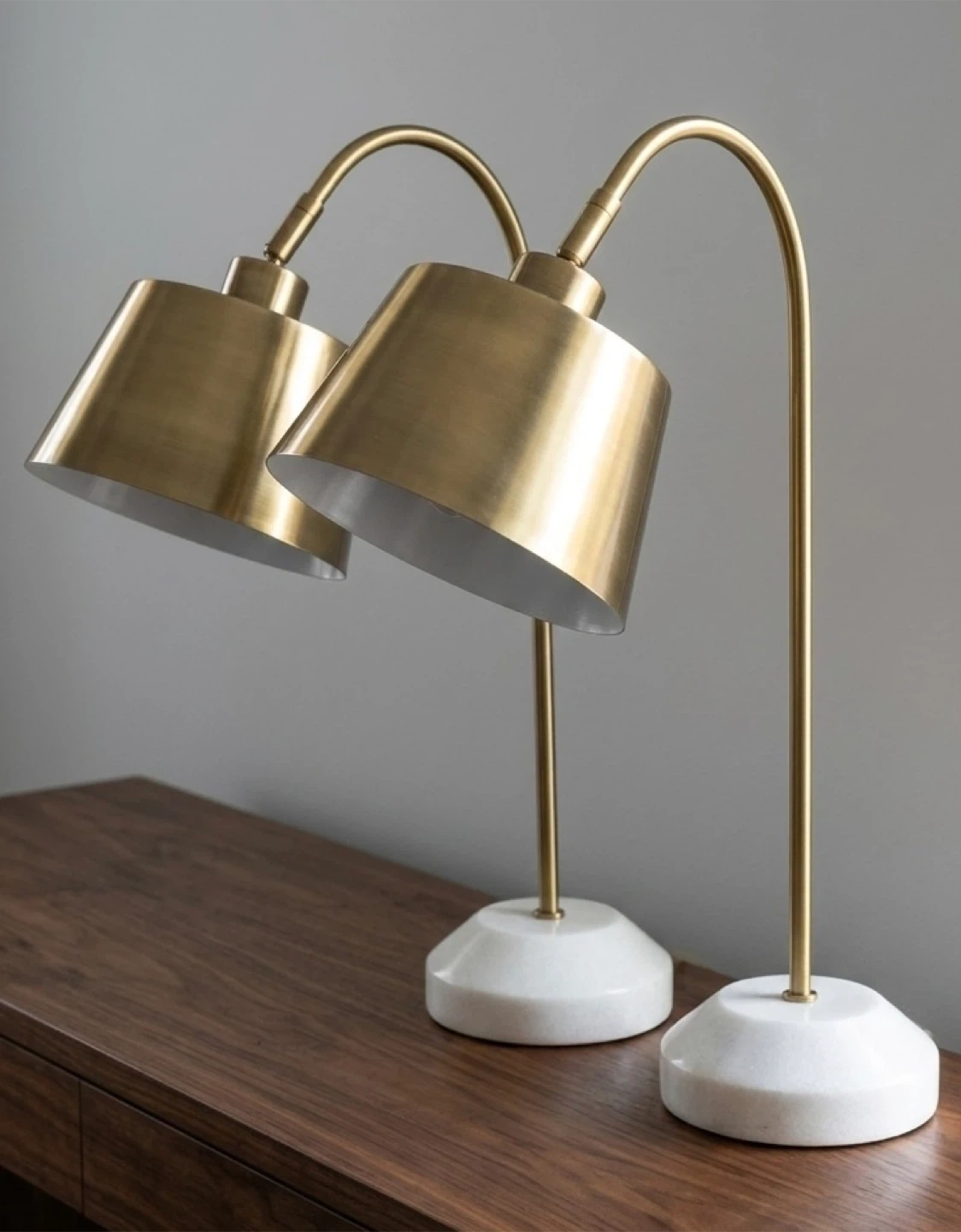 • Elegant "gooseneck" arched stems with tapered metal drum shades. Can turn the shade to change direction.