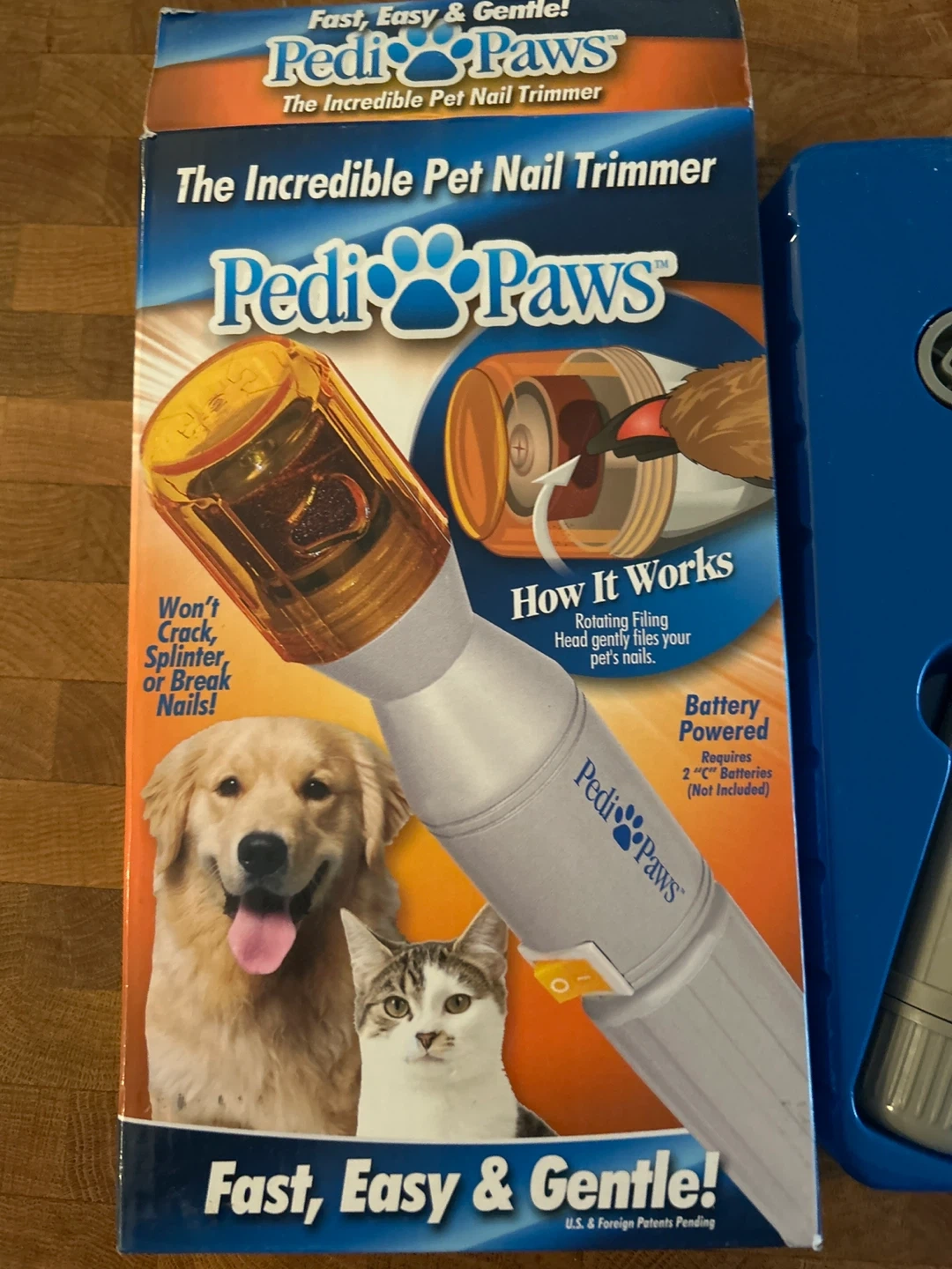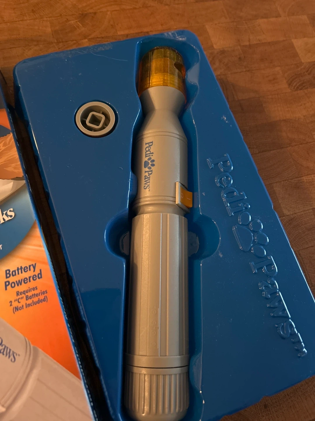 This PediPaws is the incredible pet nail trimmer. It's battery powered and requires 2 "C" batteries, not included. Won't crack, splinter, or break nails! Perfectly work no issues, my dog just doesn’t like it.