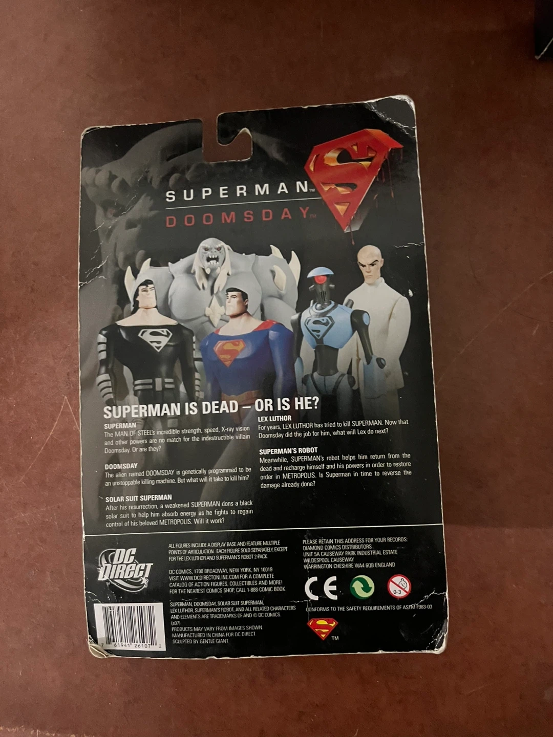 This DC Direct action figure features Superman from the Doomsday storyline. It includes a display base and is in its original packaging. This figure is a collectible for DC Comics fans.