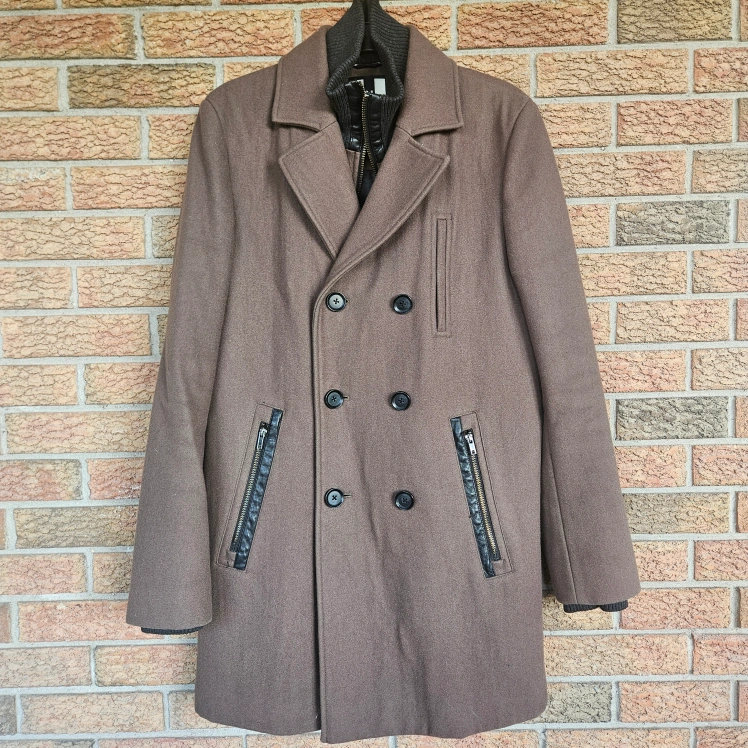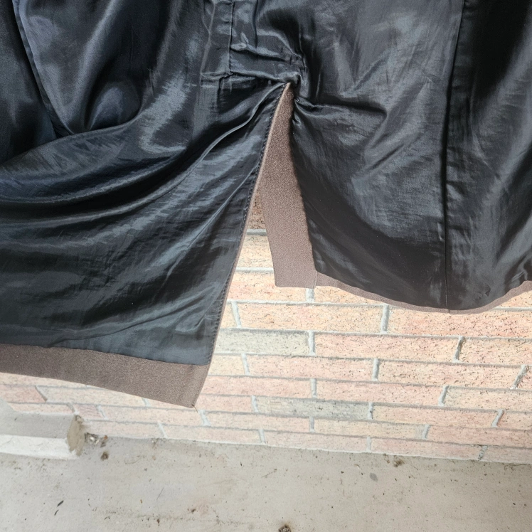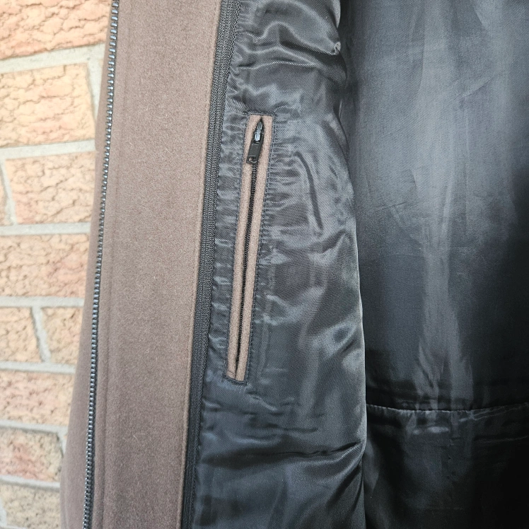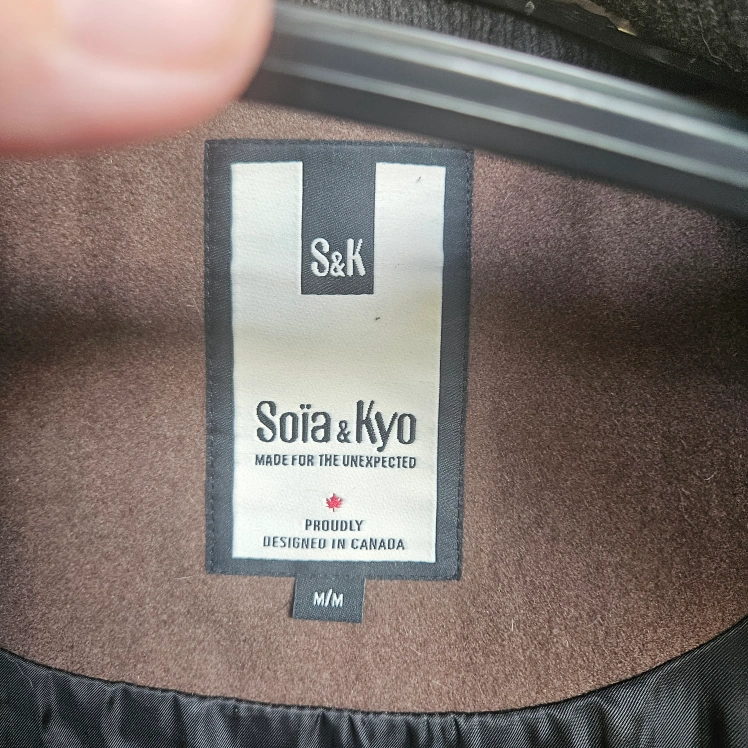Soia and Kyo brown womens Med le gth 34" Sleeve 27" pit to pit 21" double breasted buttons shell: 60% wool, 25% polyester, 15% viscose proudly designed in Canada, made in China