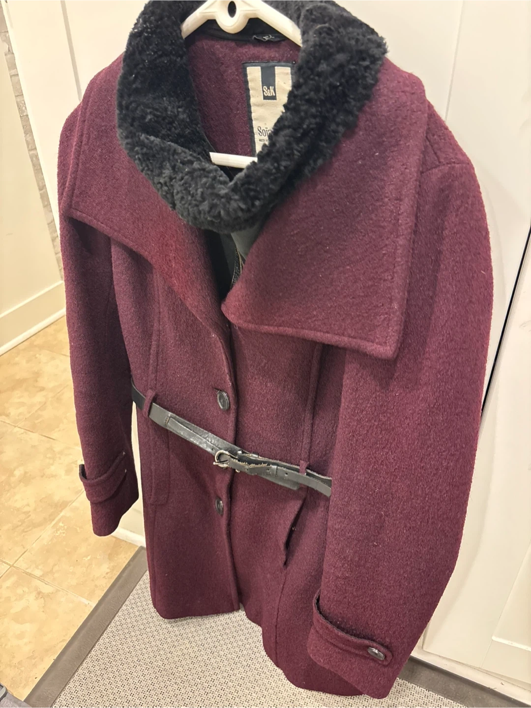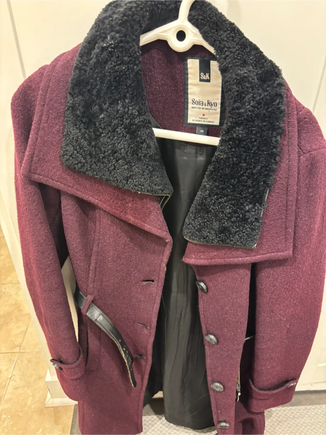 15Selling a lovely Soia & Kyo coat in size large! It's a beautiful burgundy colour and made from a wool blend. The coat features a black faux fur collar and a belted waist. There is some wear on the belt.