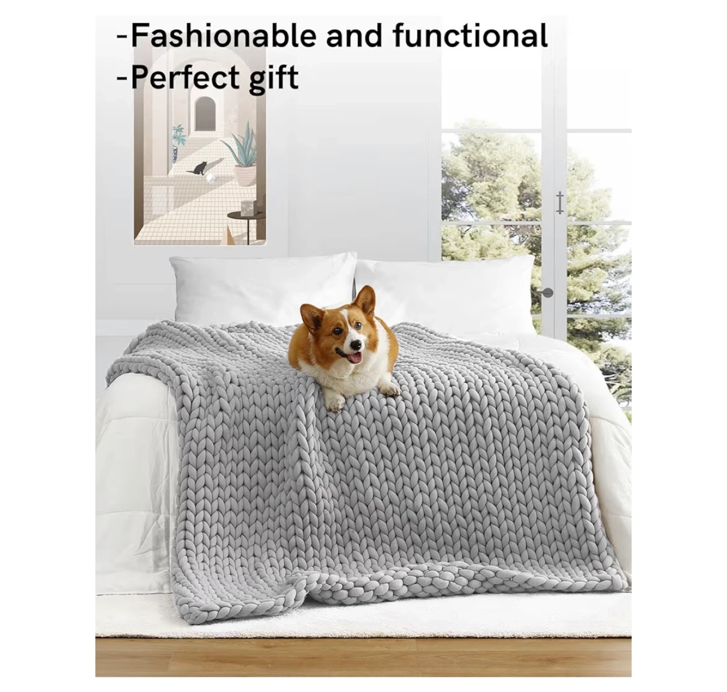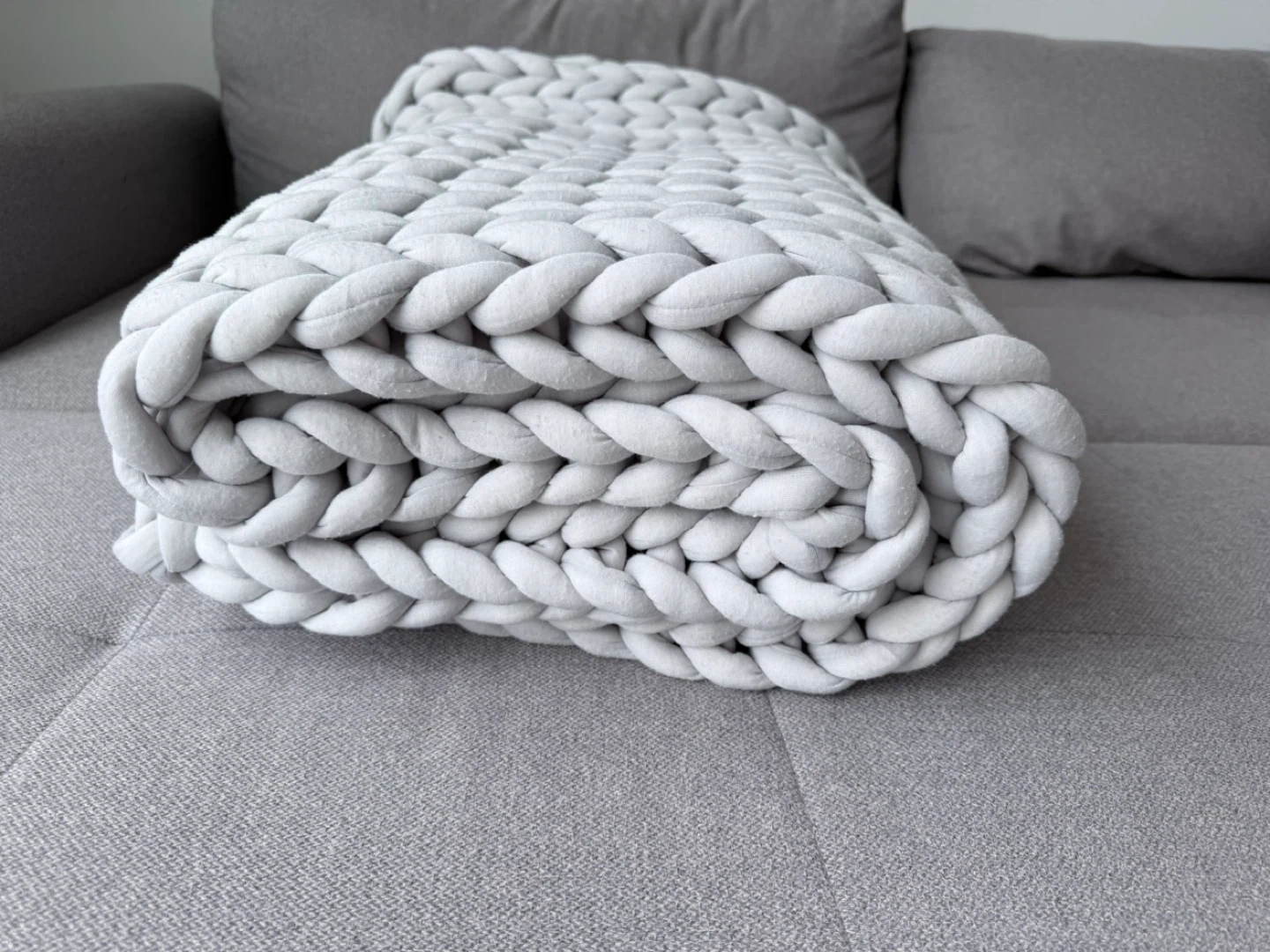 • [Build Quality] This YnM weighted blanket is handmade with care. The weight is maintained by the chunky yarn, made from 100% polyester, and the tightness of the knitting. The even knit ensures the weight is evenly distributed, so the blanket is built to last for years.