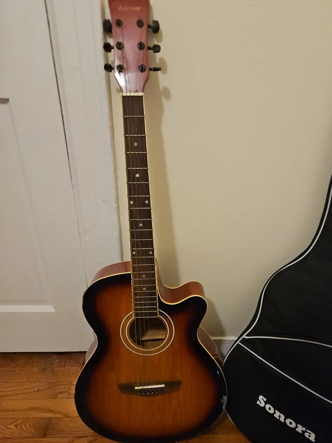 Lawson acoustic guitar with a sunburst finish. It includes a black Sonora gig bag for protection and transport. This guitar's body is made of wood with a rosewood fretboard.(however guitar has a few scratches on the back )