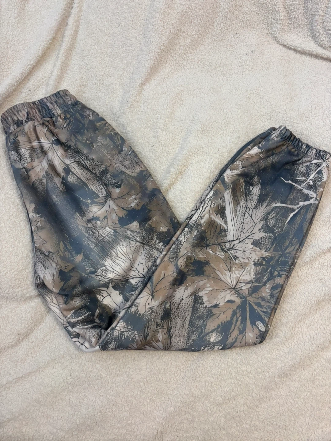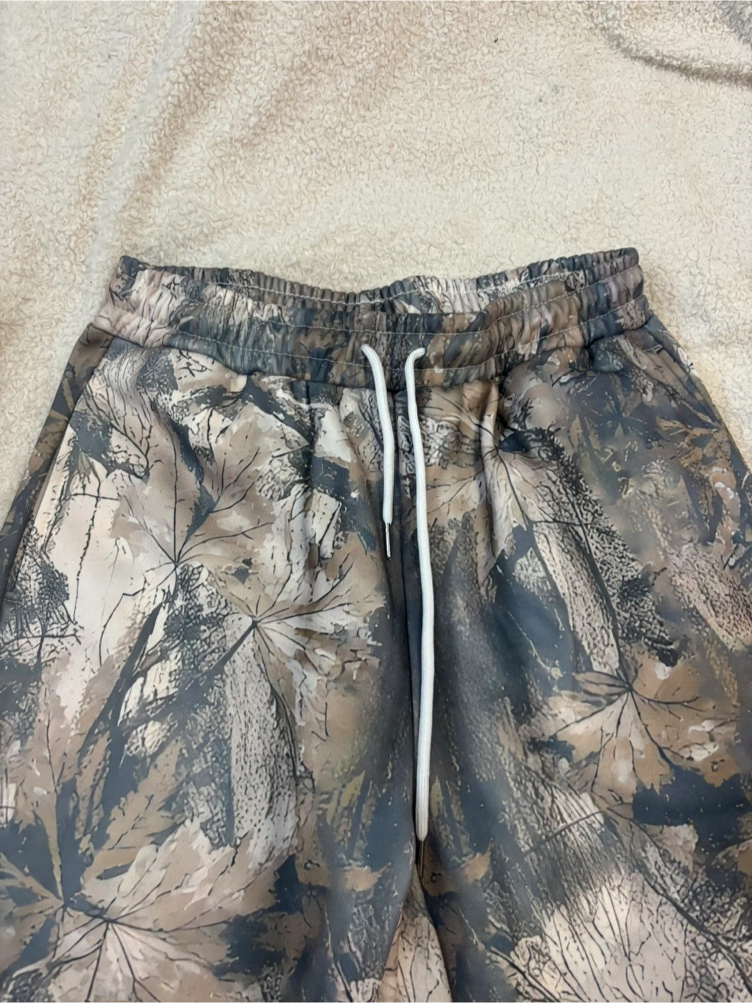 These jogger pants are camouflage print with leaf designs. They have an elastic waistband with a drawstring and elastic cuffs.