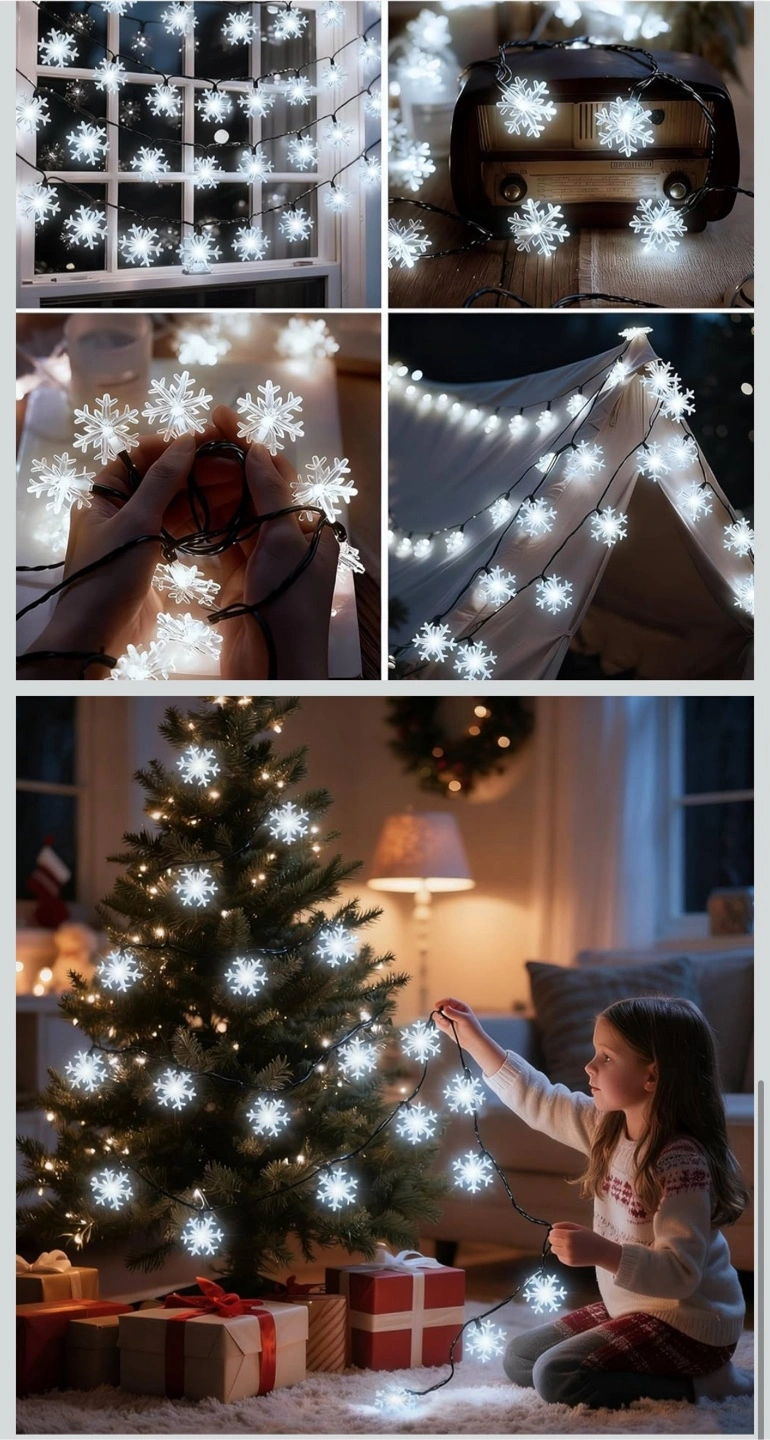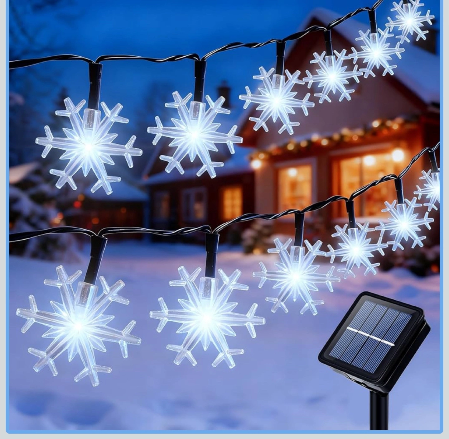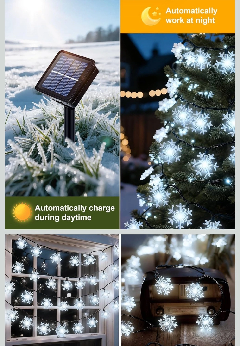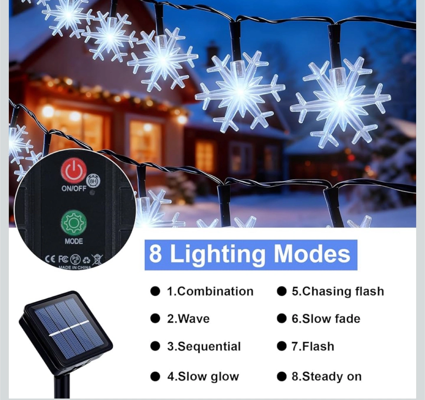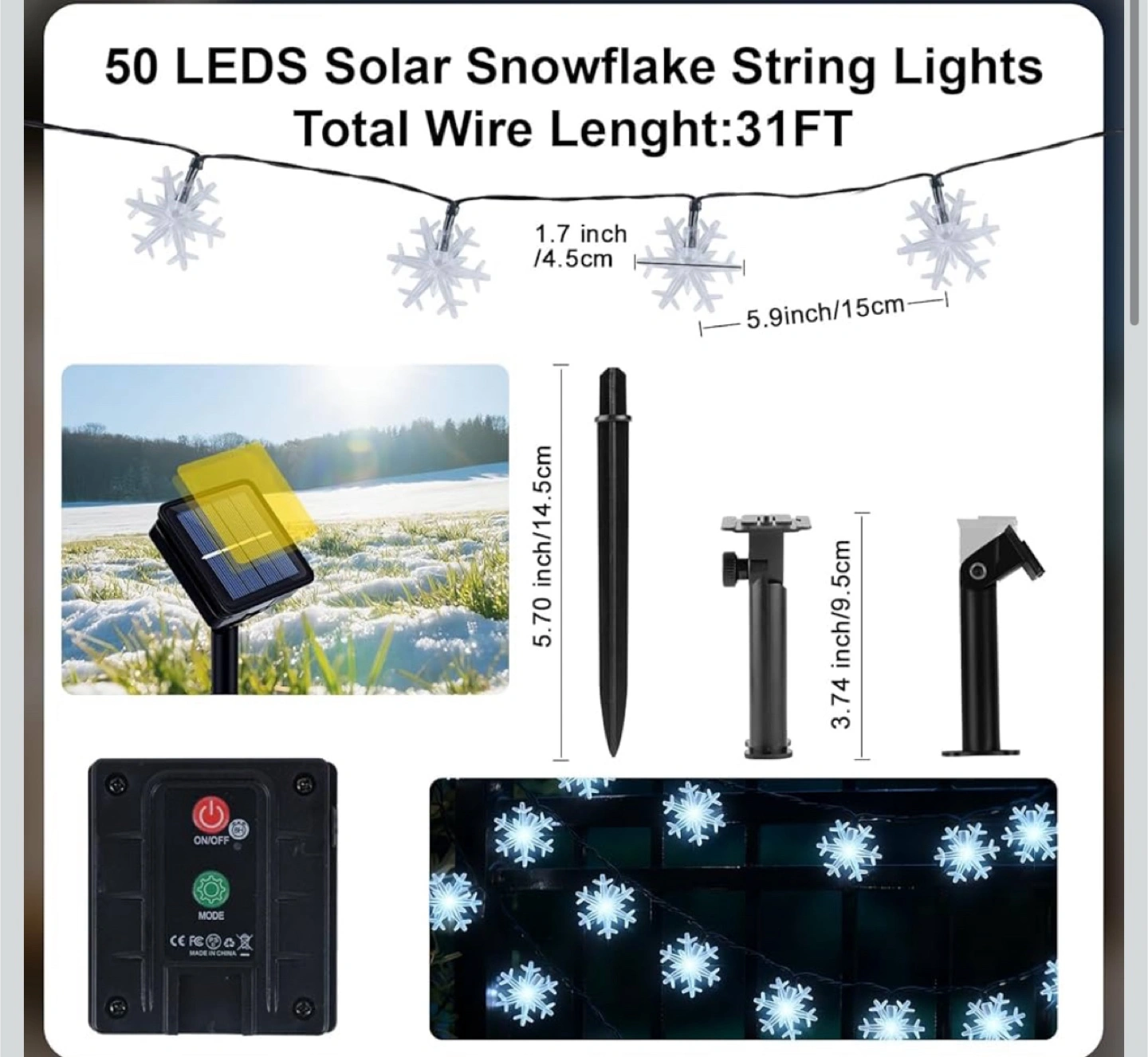 324Add a touch of winter magic to your home with these solar snowflake string lights! They feature 50 LEDs and a total wire length of 31 feet. - 8 Lighting Modes: Choose from combination, wave, sequential, slow glow, chasing flash, slow fade, flash, and steady on - Automatically work at night and charge during the daytime - Each snowflake measures approximately 1.7 inches / 4.5cm, and the spacing between them is about 5.9 inches / 15cm