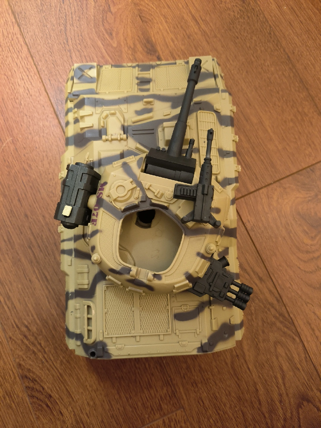 10Toy tank in good condition. Features a cool camouflage design and rotating turret.