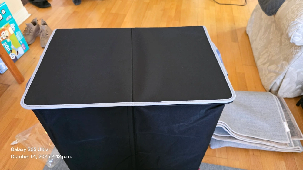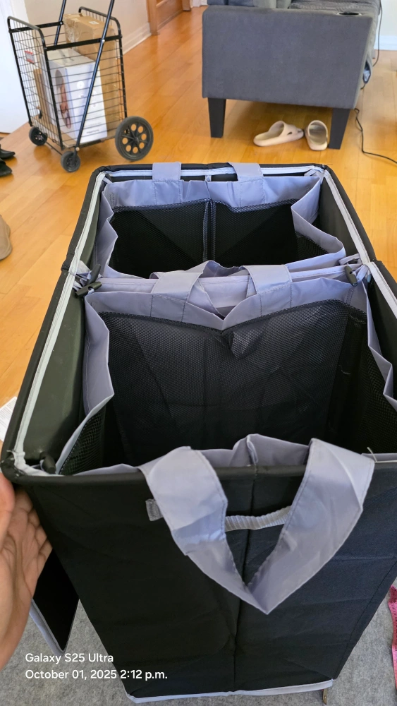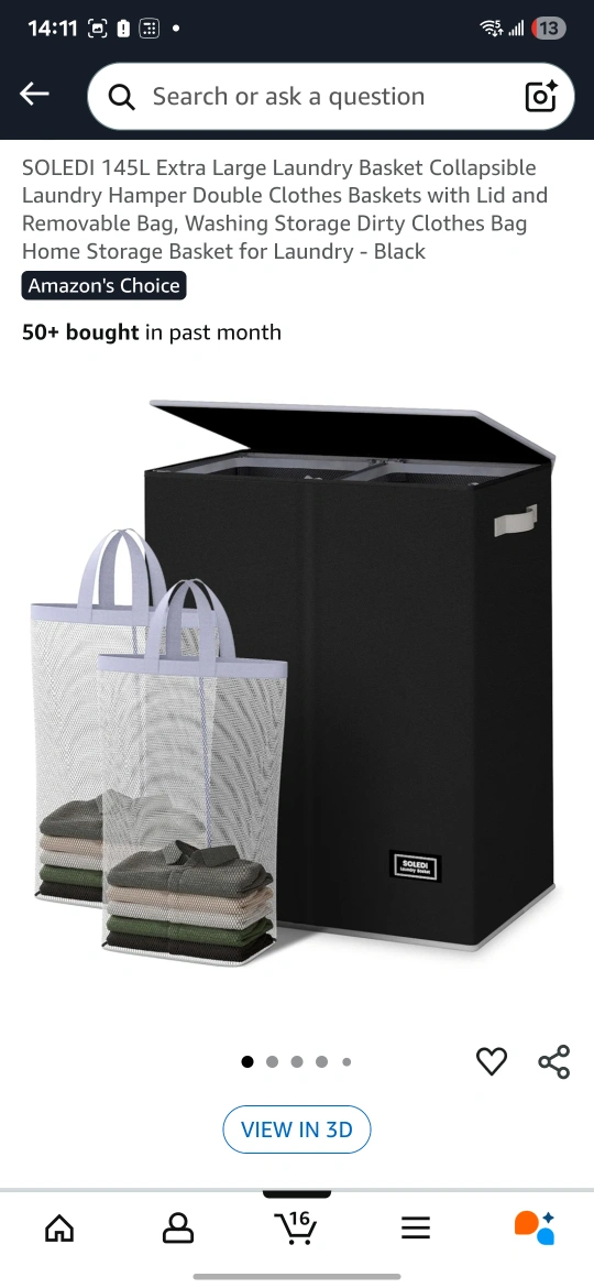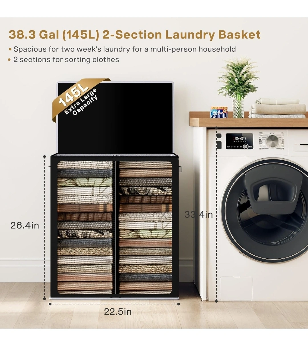 This is a SOLEDÌ 145L extra large laundry basket in black. It has a collapsible design with a lid and removable bags, perfect for sorting your laundry. It holds 38.3 Gal (145L) and has 2 sections for sorting clothes. Dimensions are 26.4in x 22.5in x 33.4in
