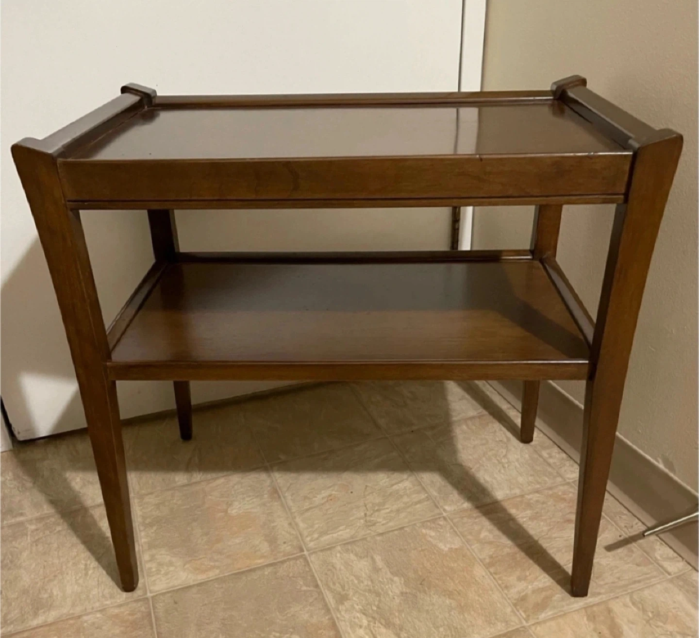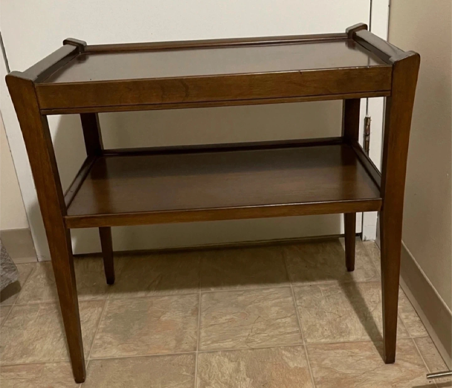 643Solid and sturdy dark brown wooden end/side table. Two shelves. Simple design. Perfect for a living room, bedroom, or entryway. It can also be used as a shoe rack. It's in Excellent condition. From smoke-free, pest-free, and pet-free home. Dimensions in Inches: 24.5” Wide x 14.5” Deep x 23.5” High Shelf Height: 9” Cash and pick up only. **Feel free to check my other listings** **Important Notes** 1) The Karrot platform operates on a "final sale" basis, meaning buyers are responsible for their purchases. No returns, and no refund once the purchase is finalized. 2) Buyers are encouraged to carefully check the item descriptions and dimensions before contacting the seller to show their interest. 3) Buyers are advised to inspect the item before finalizing the purchase.
