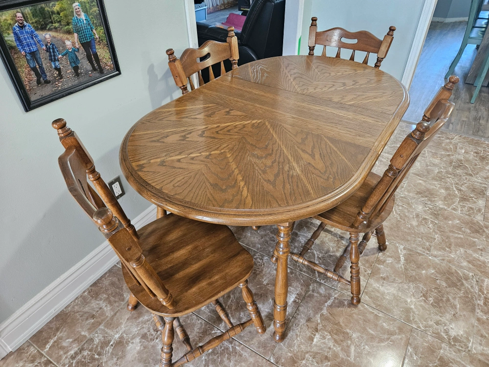 Selling a solid wood dining table with four matching chairs. The table has a beautiful wood grain pattern and a classic design. It's perfect for family dinners or entertaining guests. Image has extension shiwn, can remove for smaller, round table.The set is in good condition and ready for a new home!