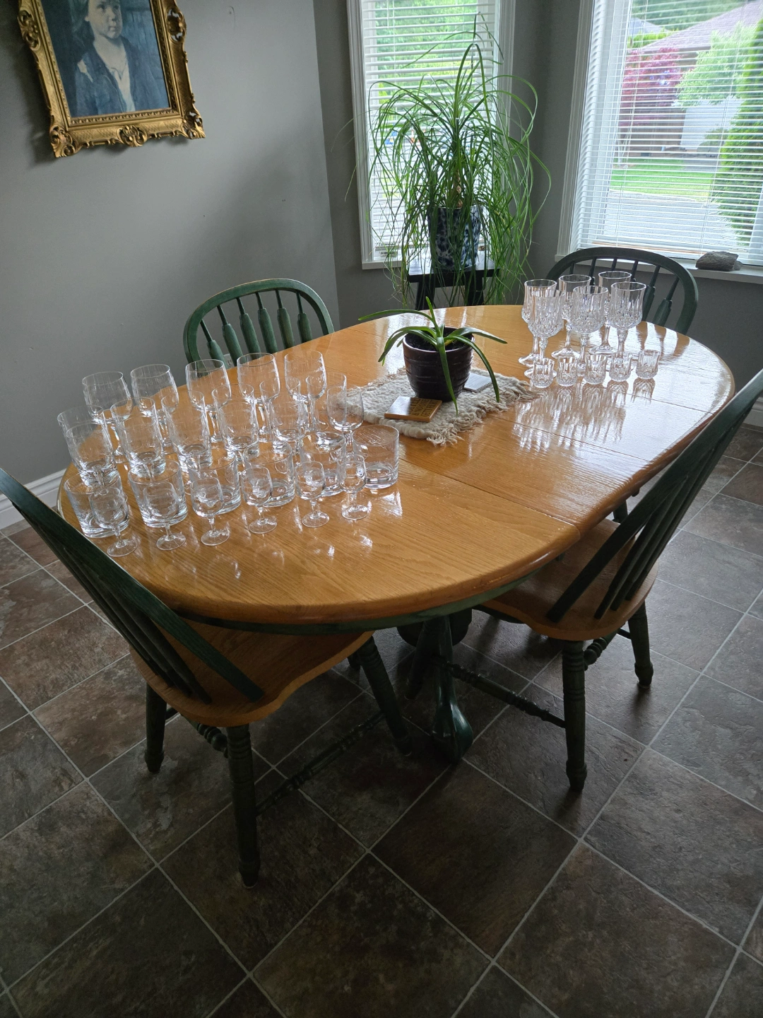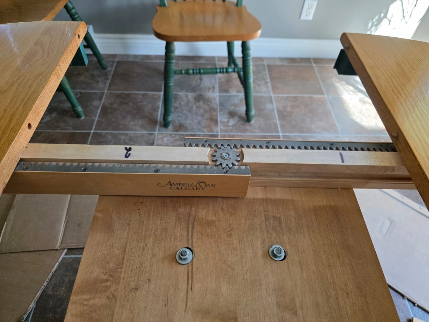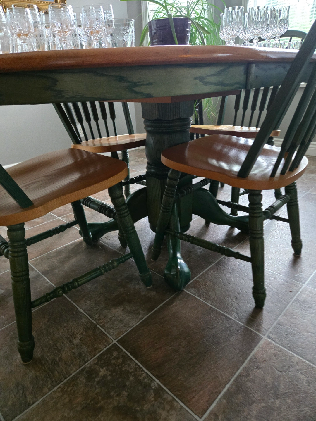 10Solid oak table made by Amber's Oak in Calgary. Two leafs to extend table from round to oval using a cog system. Table top has been refinished with 3 coats of acrylic polyurethane. If you would like to add another coat, finish and correct paint brush are included. Diameter is 42". Add both leafs and it's 5 (60") feet long and very comfortably seats 6 people. If you only add one leaf, it's approximately 51" long.