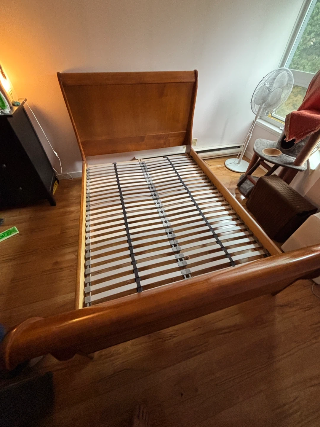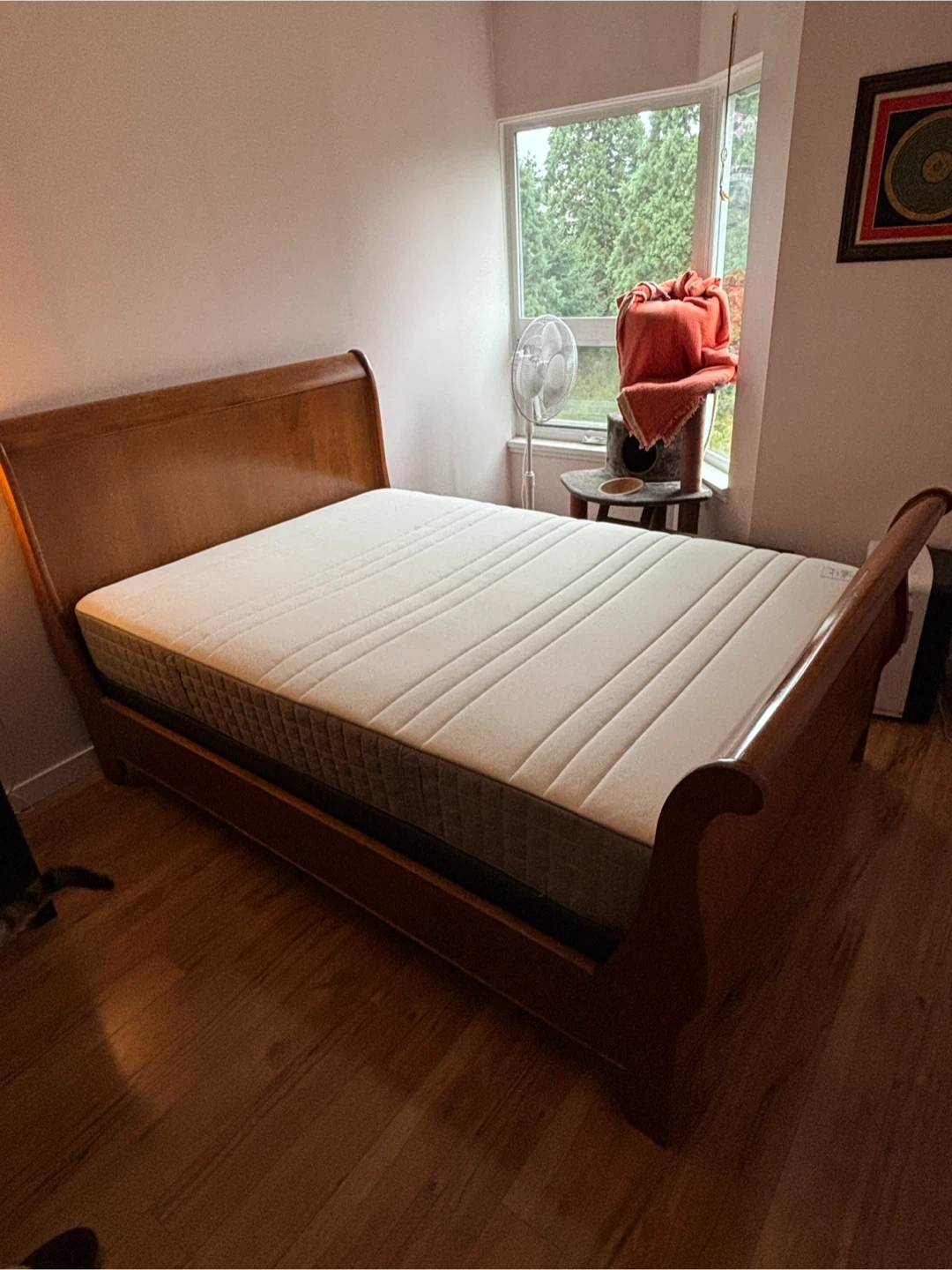 96Selling a solid oak wooden sleigh bed frame size double. It's in good condition and ready for a new home. It has a golden autumn auburn stain. Double / Full size. Mattress and box spring available too. Perfect for adding a touch of classic style to your bedroom. It's sturdy and well-maintained, ensuring a comfortable and stylish sleep experience. It has a couple of minor scuffs. Made in Middle Canada🍁