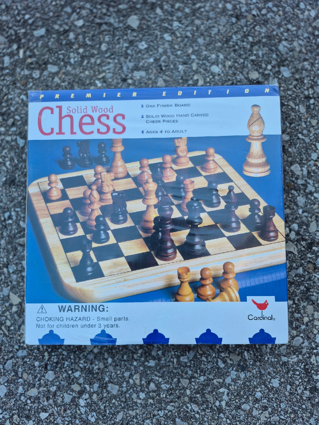 60Selling a Cardinal Solid Wood Chess set, Premier Edition. This set features an oak finish board and solid wood hand-carved chess pieces. Recommended for ages 4 to adult. It's a great set for family fun!