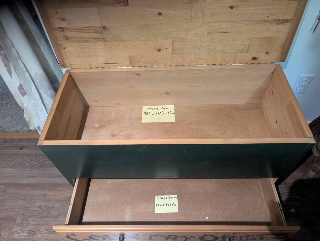 Beautiful Solid Wood Painted Chest This hand made and beautiful painted chest is solid wood (with the exception of the drawer bottom made of plywood) with a large storage area and bottom drawer for extra space. Heavy and durable, this chest has a few knicks from wear and tear but is in great condition and will last many, many years. Great as is but If the design isn't your thing, it would be easy to sand down or paint over. Overall Dimensions: 36" W x 16" D x 21.5" H. Pictures above include inner dimensions of main storage space and drawer.