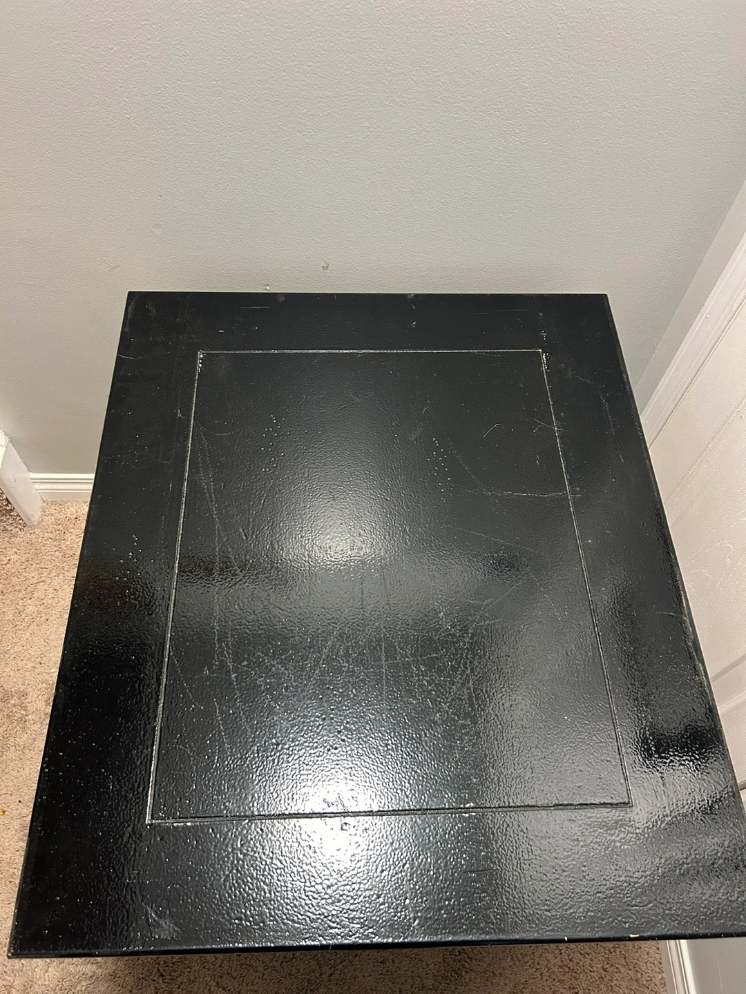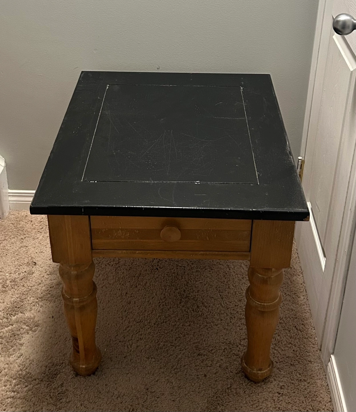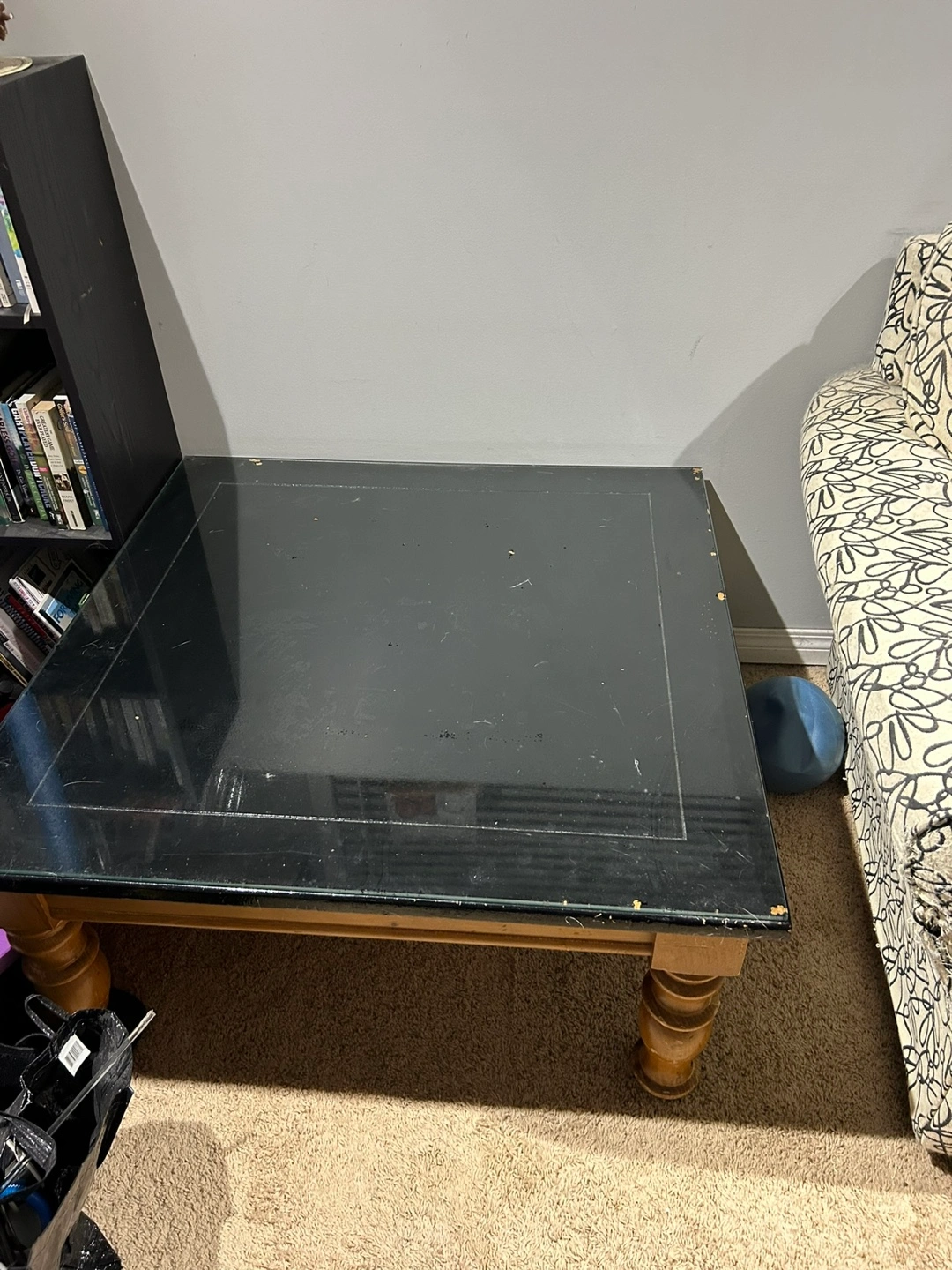 10Square coffee table with wooden legs, and a small drawer. Glass top removed as one is broken. Tops could use a refresh but solid well built. Side tables have small drawer.