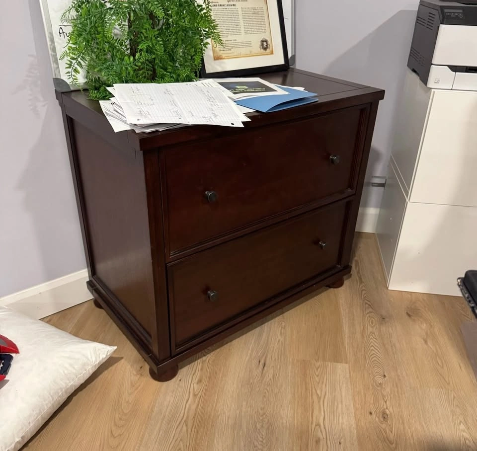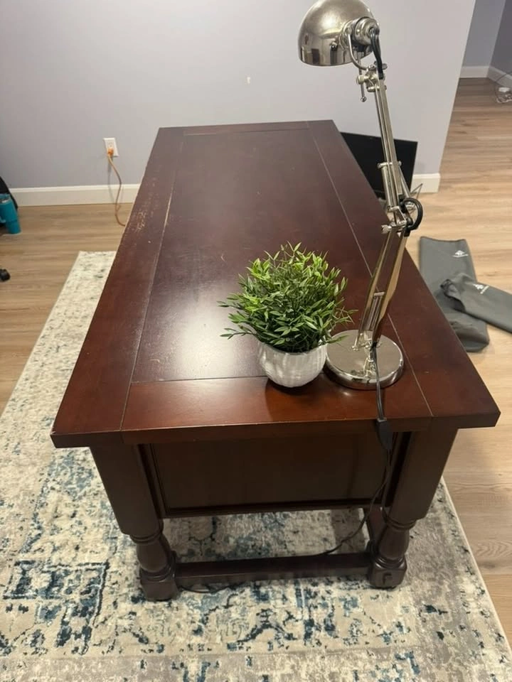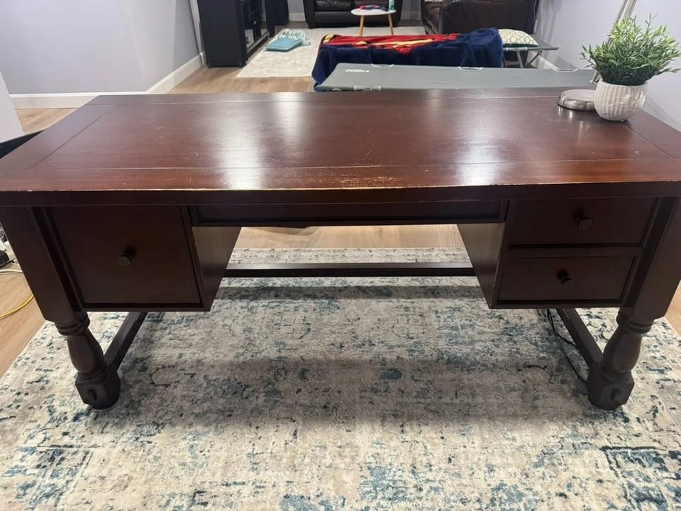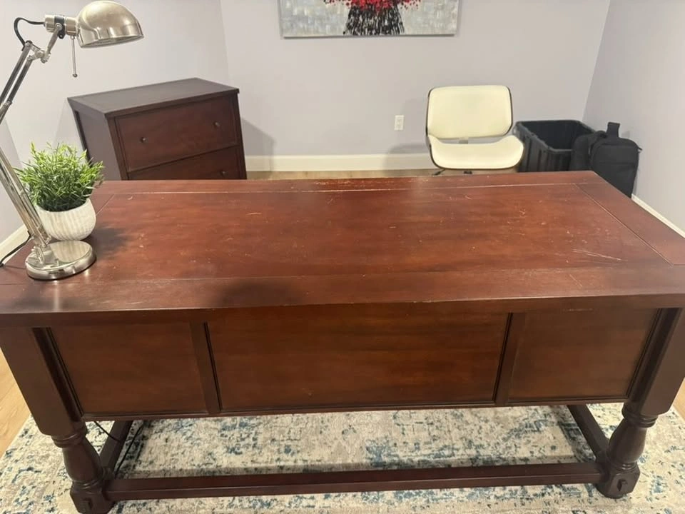 Upgrade your workspace with this elegant and sturdy solid wood office set. Desk Details: Solid wood construction—very durable and stable. 1 large file drawer, 2 smaller storage drawers, and a retractable keyboard shelf. Classic design with turned legs and rich dark wood finish. Spacious desktop for monitors, paperwork, and more. Good used condition with some surface wear. Filing Cabinet Details: Solid wood, 2 deep drawers—perfect for standard files. Matches the desk in style and finish. Smooth-glide drawers, classic lines $400 for both pieces as a set. Perfect for a home office, study, or professional space. Pickup only in South Rosebank Pickering. Smoke-free home.
