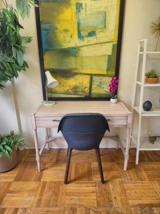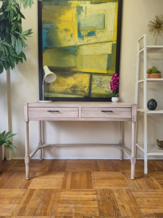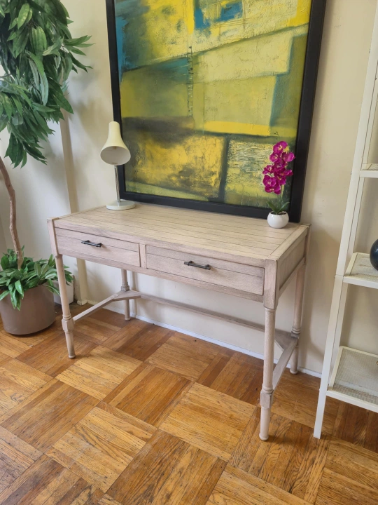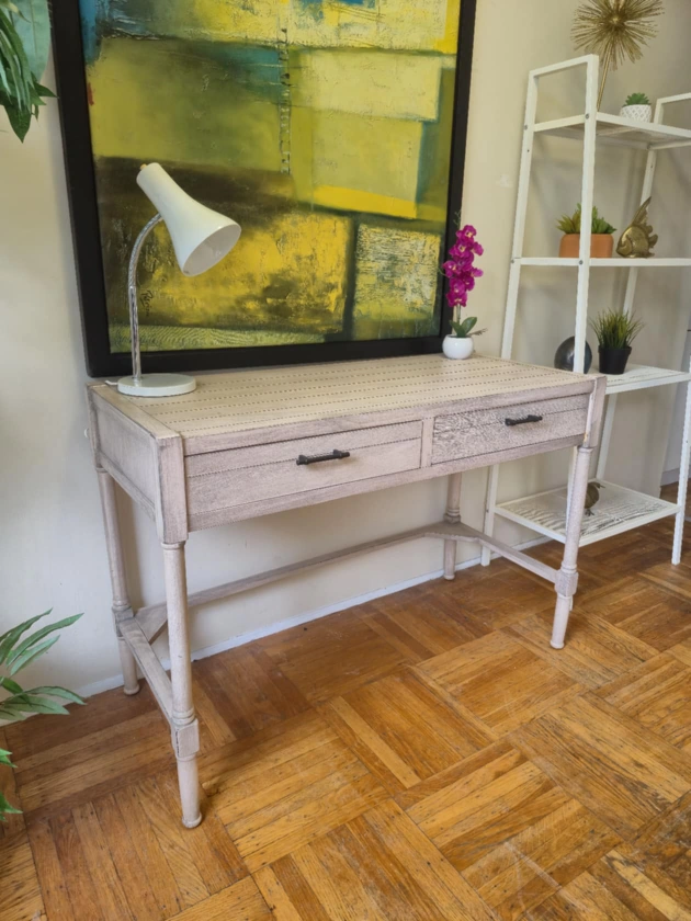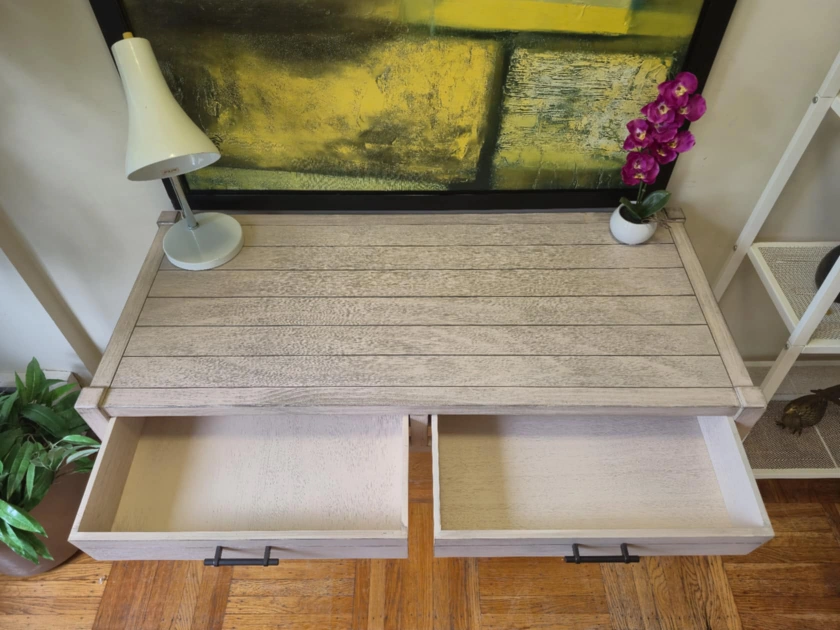 Solid Wood Desk With 2 Drawers And USB/Outlets 41.5 inch width x 18.5 inch depth x 29.5 inch height 2 USB ports located in the back as well as 1 outlet. Delivery Available Pick up in downtown Vancouver or delivery may be arranged for a reasonable fee. Tags: retro vintage antique 1940s 1950s 1960s 1970s sixties mcm mid century modern furniture teak walnut rosewood mahogany beech elm solid wood desk computer writing bureau secretary Danish Denmark Sweden Scandinavian Norway living room bedroom solarium den home office workspace cb2 eq3 pottery barn crate and barrel structube article gibbard vicart Knechtel dixie film tv set dec westendtrends furniture chair dining chairs