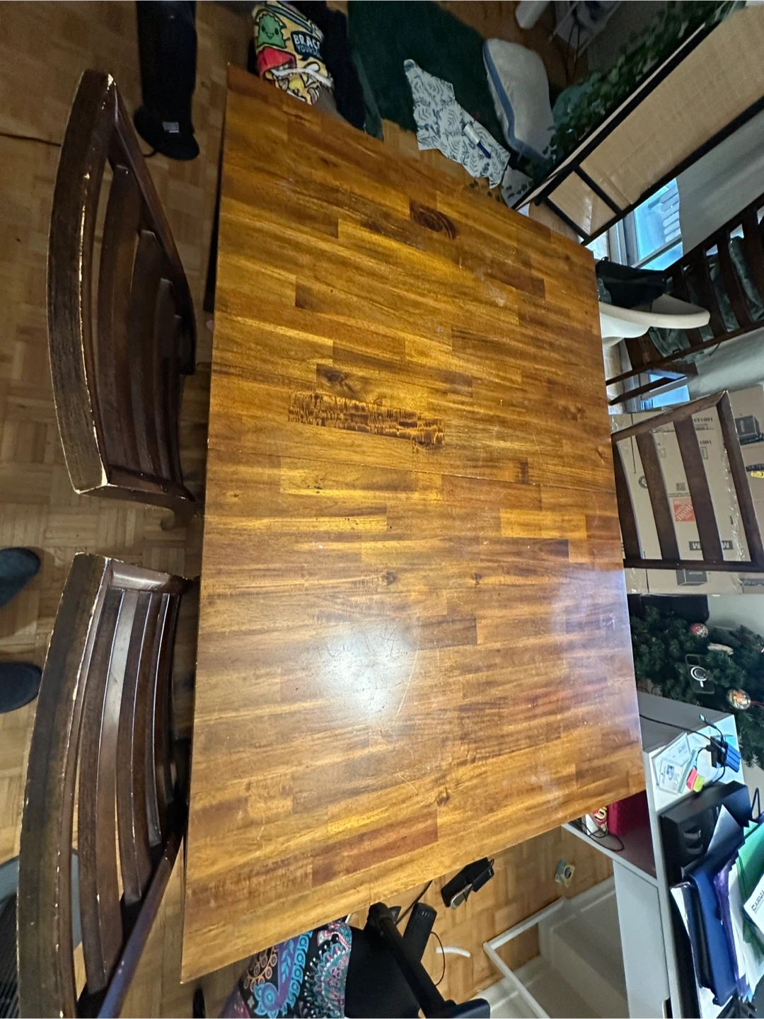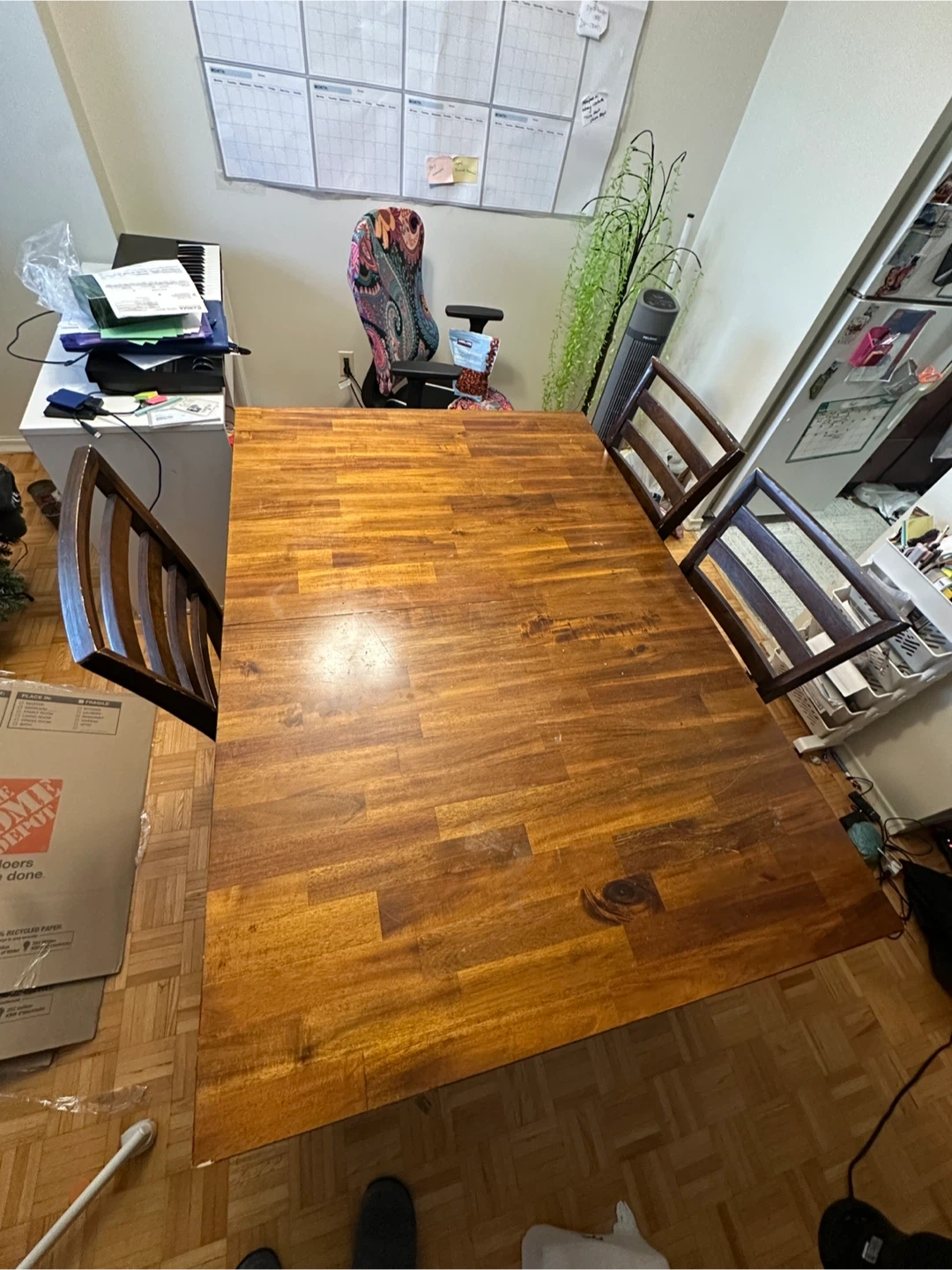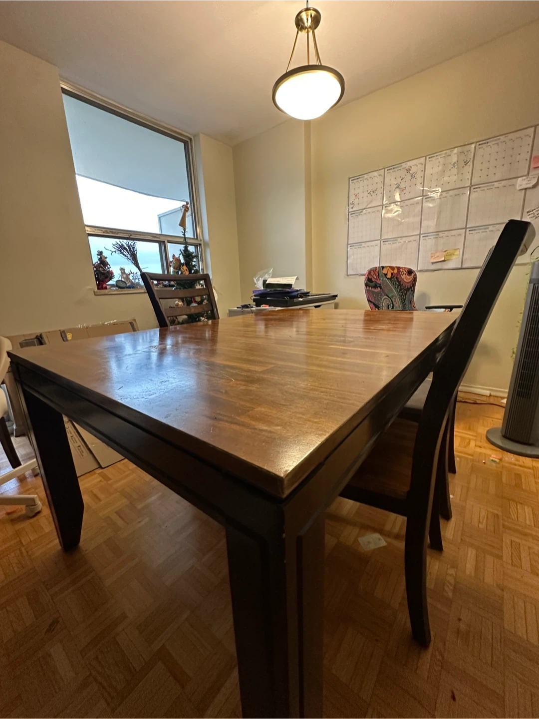 I’m moving in one week. So, parting ways with a lovely Expandable Solid Wood Dining Table with four matching chairs. It's in great shape and would be perfect for a family or anyone who enjoys hosting dinners. The table has a beautiful wood grain finish that adds warmth to any dining space. Pick Up Only