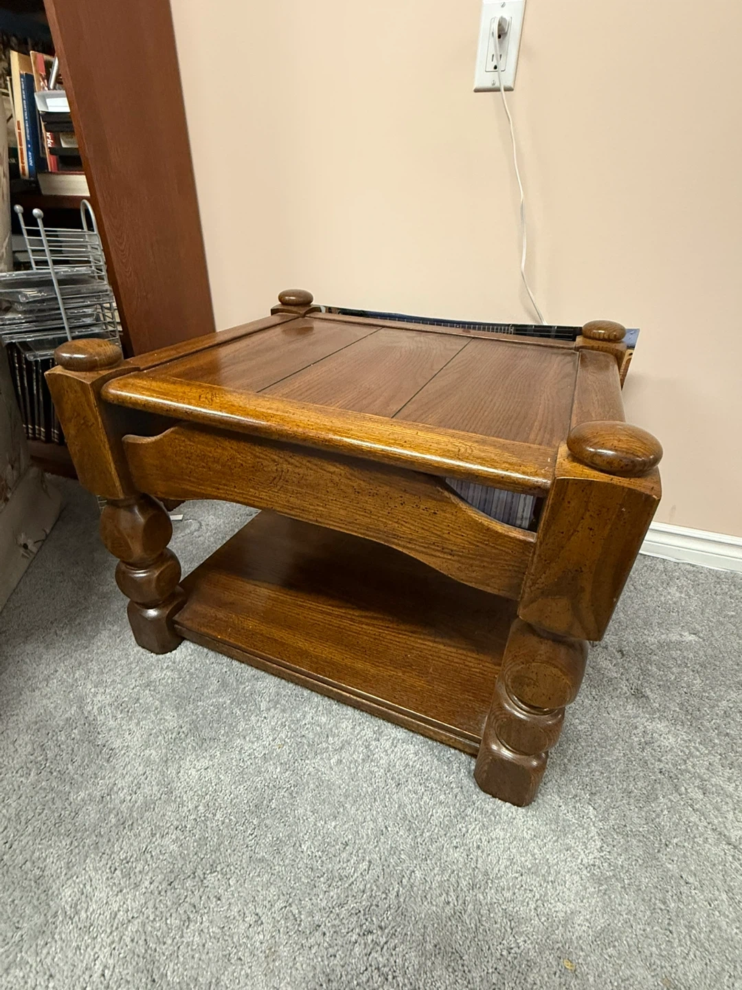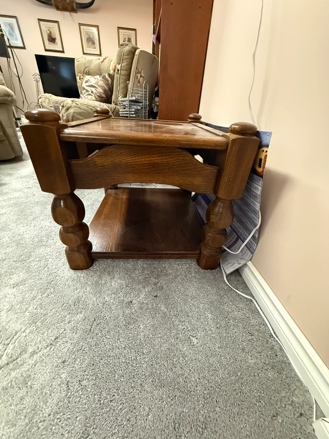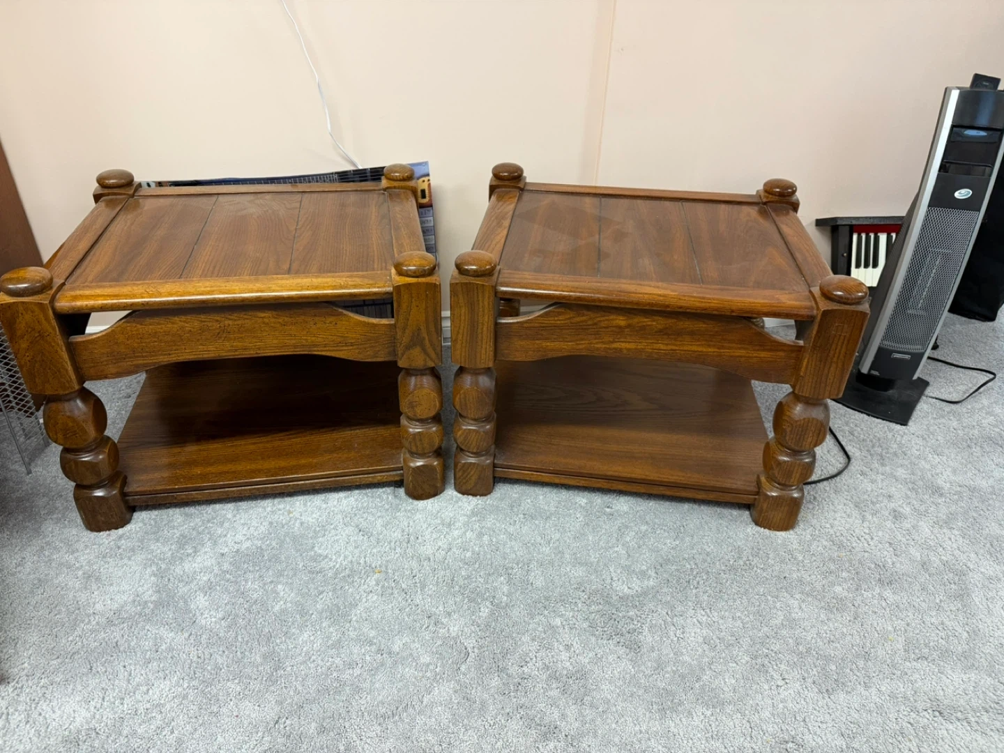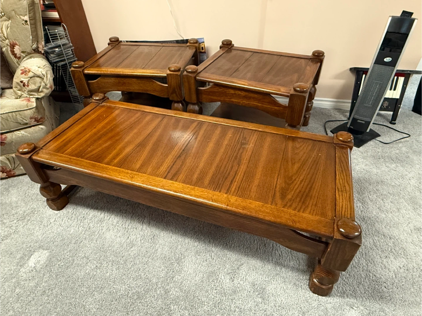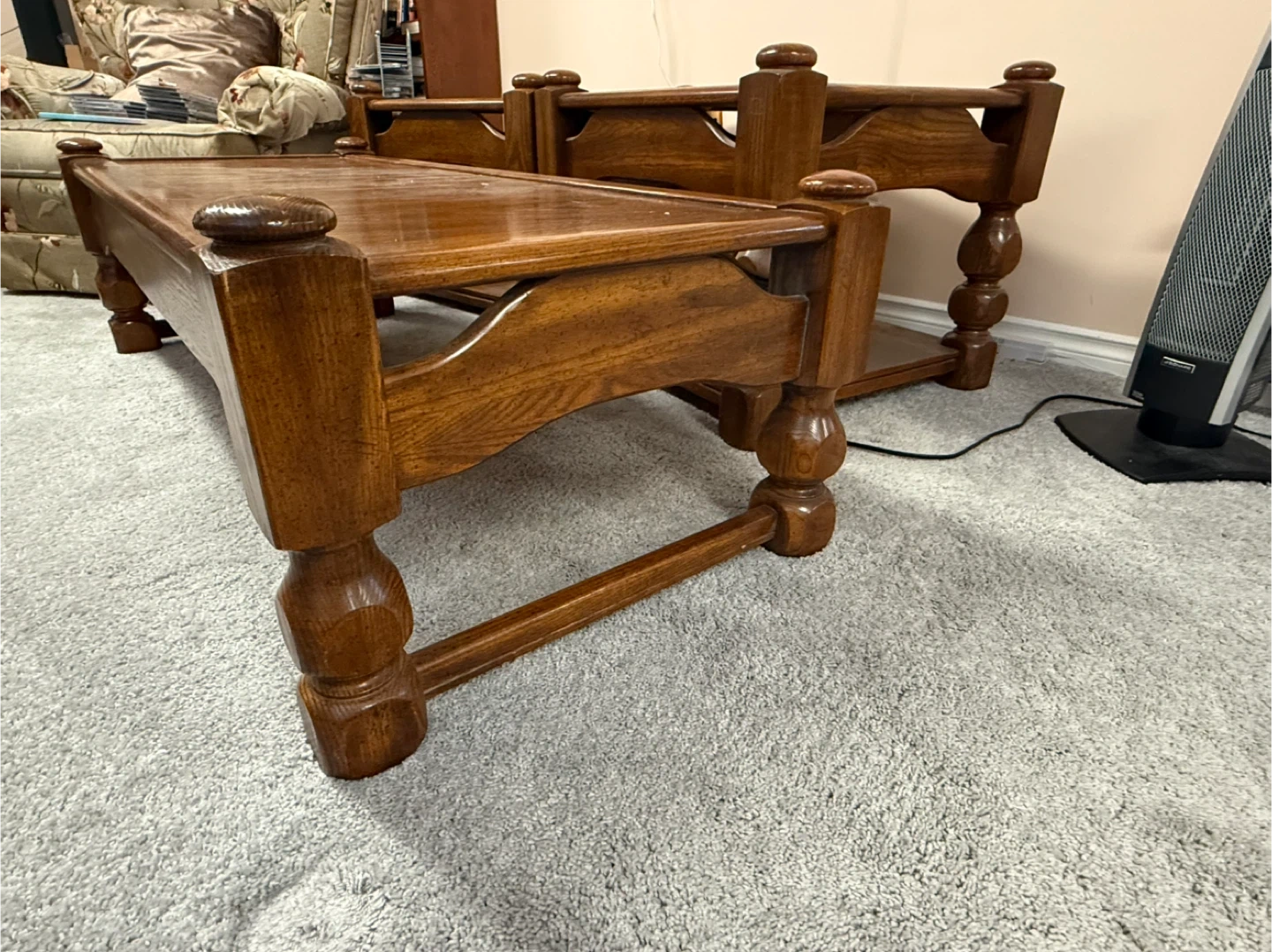 Selling a set of solid wood living room tables. They are in good condition and would look great in any living room or bedroom. The tables have a classic design with a shelf for extra storage. Perfect for lamps, books, or decorations! They don’t make them like these anymore.