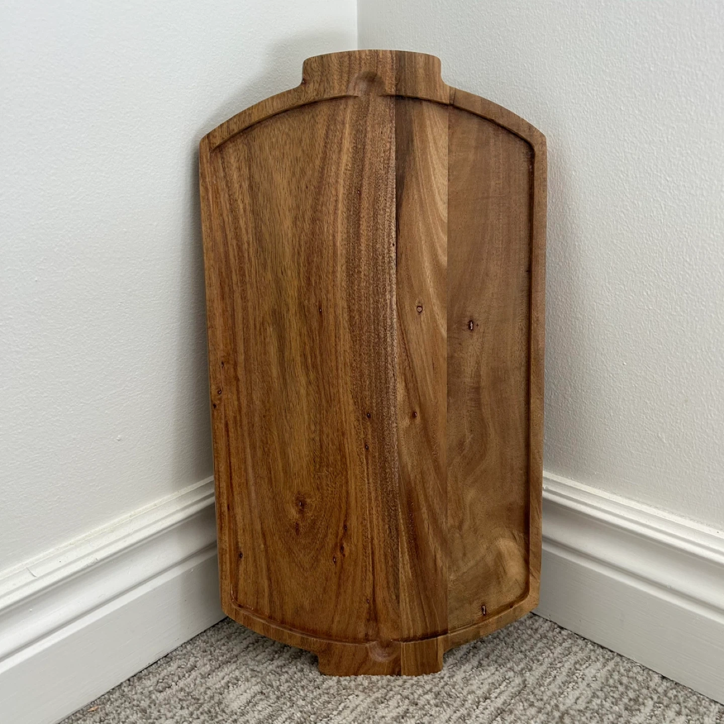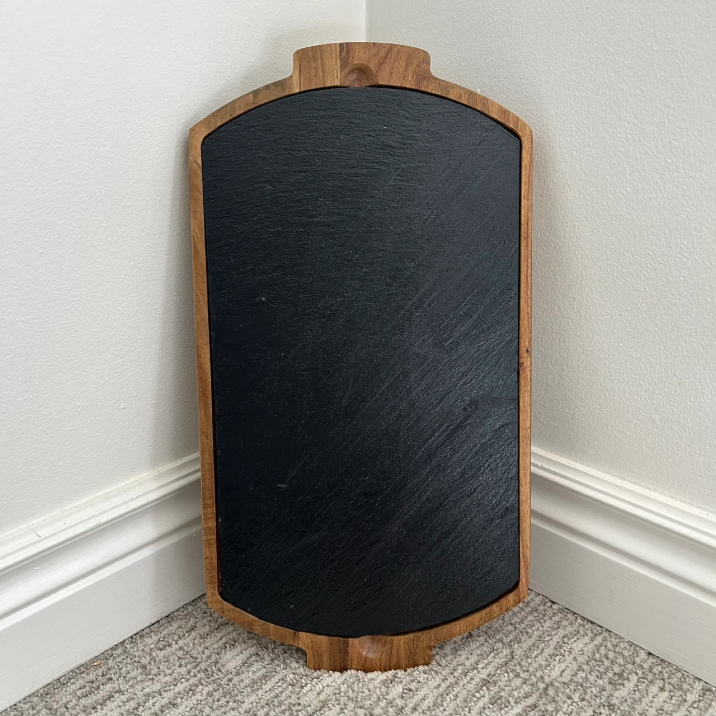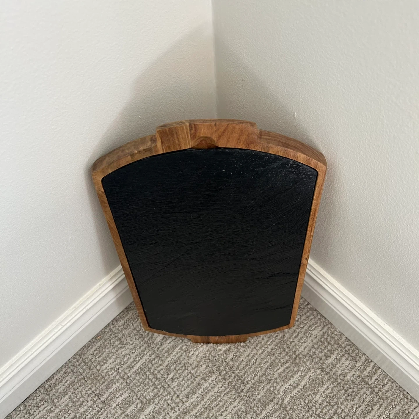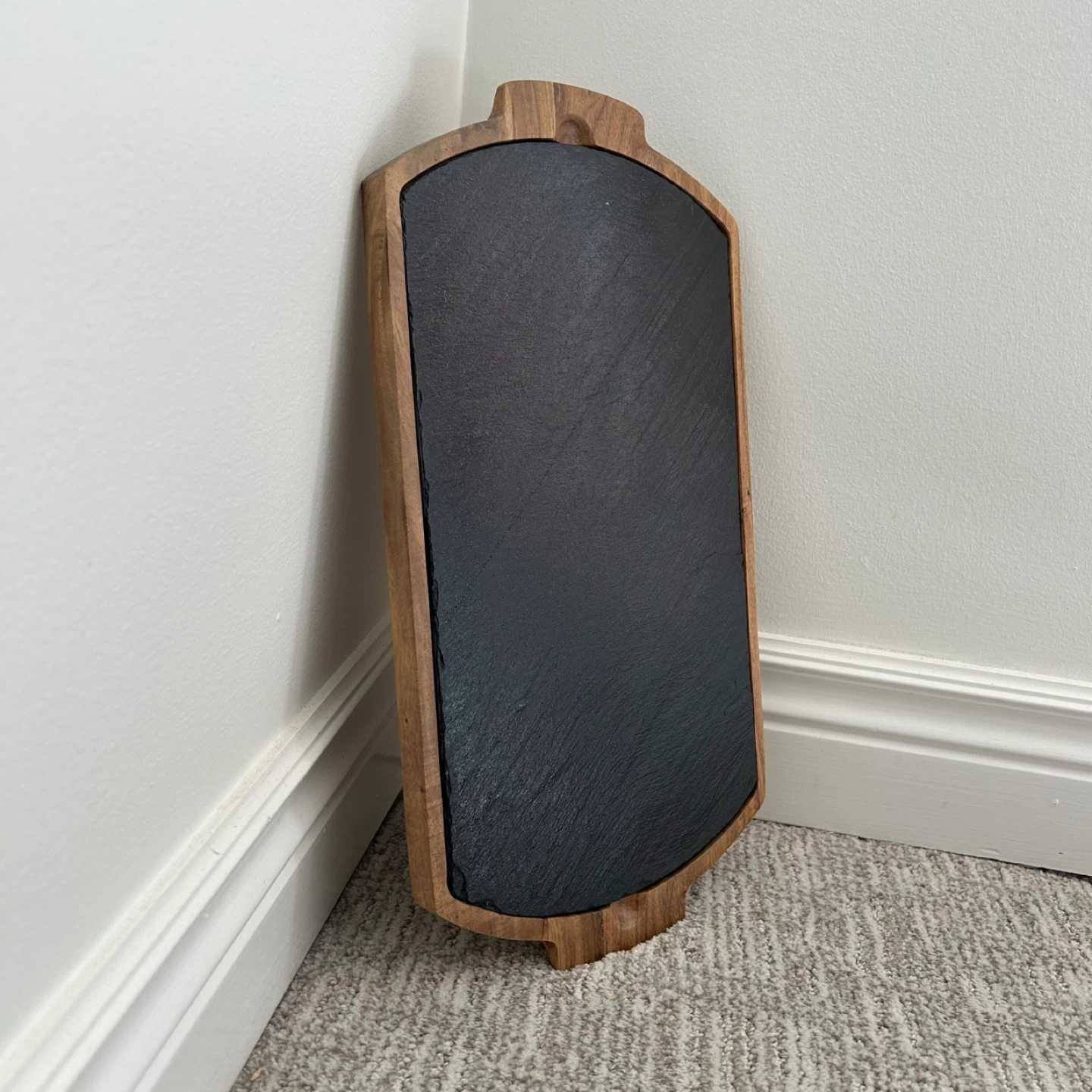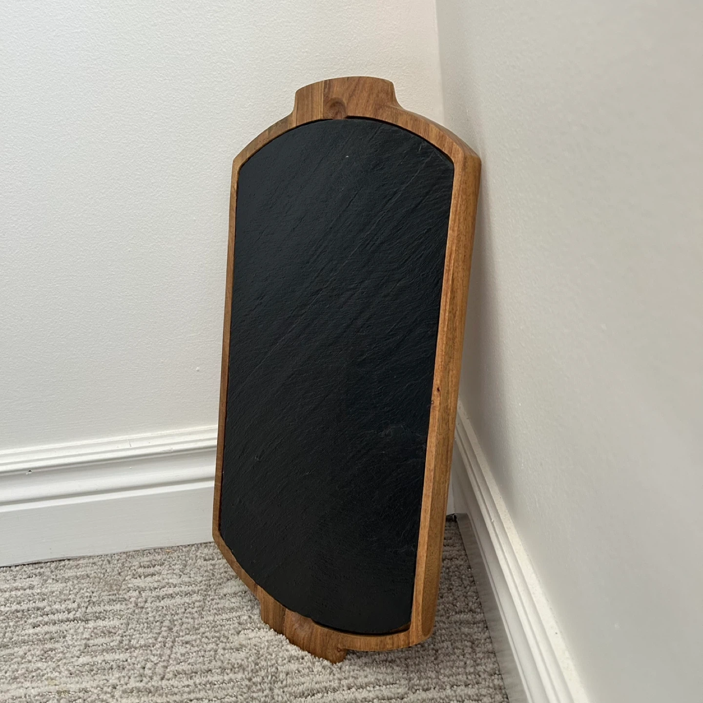 Refinished Wood Serving Tray Applied With A Clear Coat On The Wood And Food Safe Oil On The Slate (Dimension) Board Length - 15 1/2 Inches Board Width - 8 1/4 Inches Board Thickness - 3/4 Of An Inch Slate Length - 13 1/2 Inches Slate Width - 7 1/2 Inches
