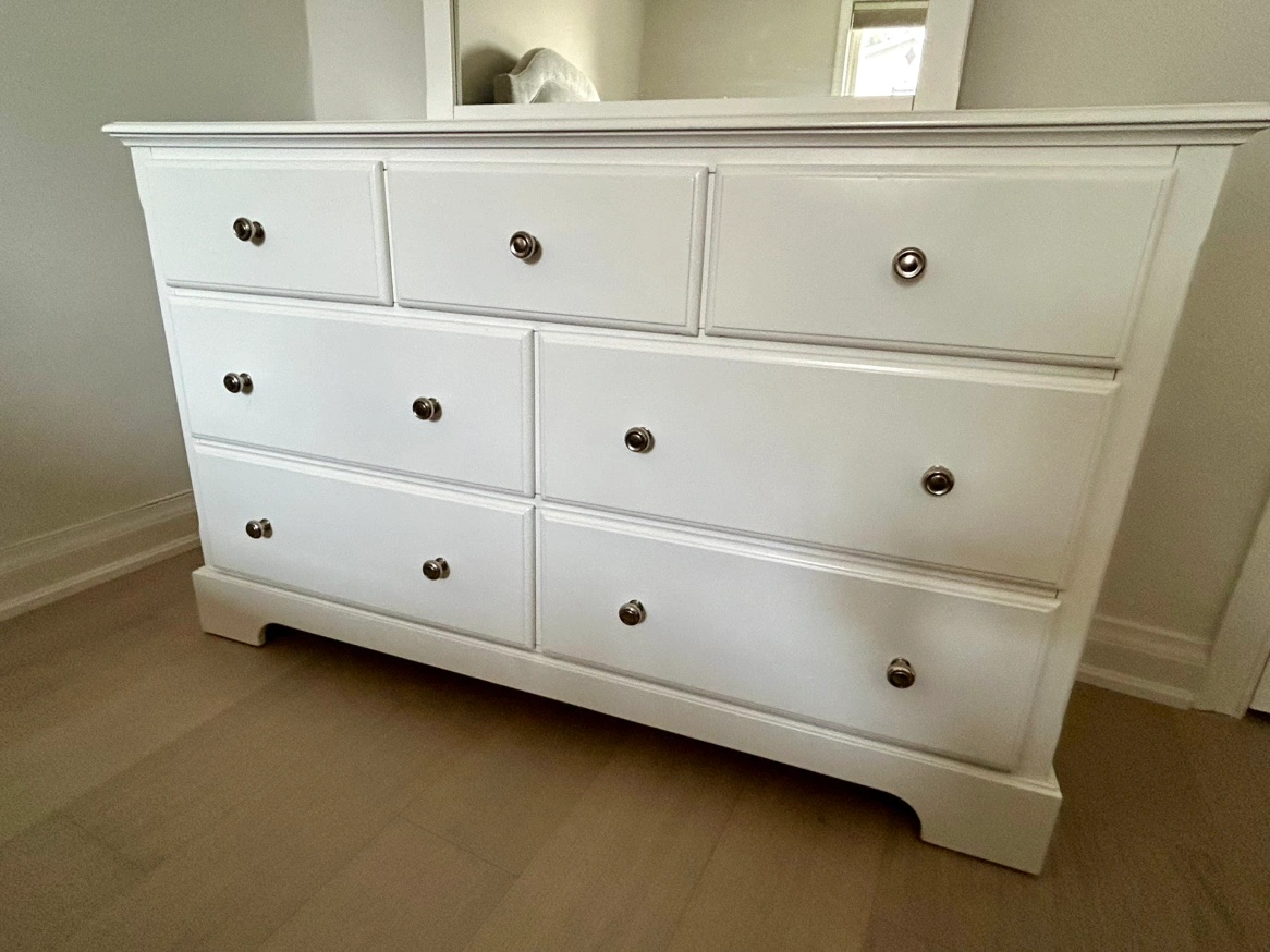 10Excellent used white solid wood dresser and night table 7 drawer dresser with detachable framed mirror and matching 2 drawer bedside table. Made of solid wood and in excellent condition. Dresser: 53' L x 19' W x 75' H (with mirror removed the dresser is 33' H) Nightside Table: 24'L x 15 1/2' W x 24' L