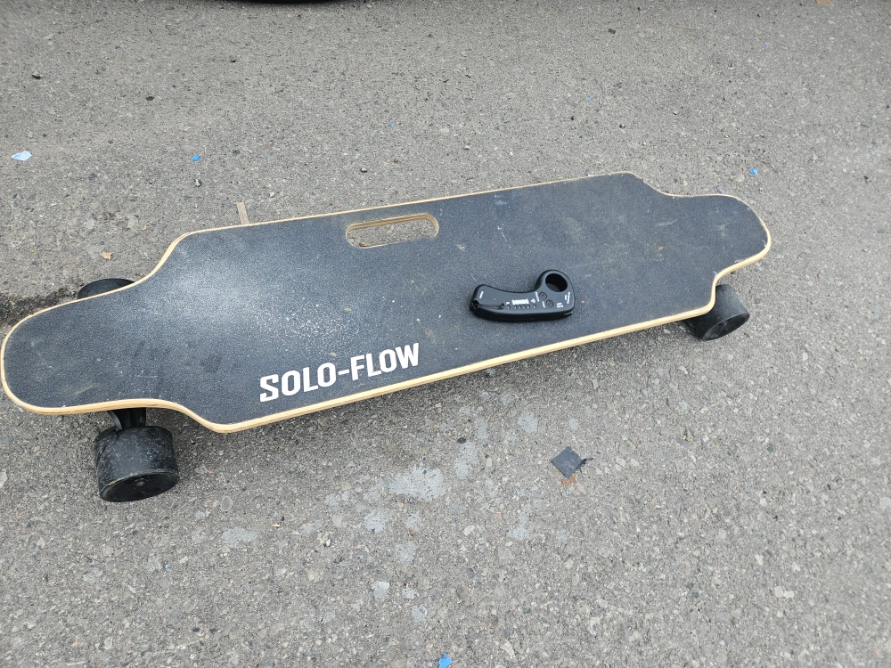 65Selling a Solo-Flow electric skateboard! It's in used condition, but still has lots of life left. From the label, it looks like the manufacturer date is 2022 February 02. Perfect for cruising around town! Only issue is it needs a new battery. No low ballers If the ad is up its available dont msg if it is available i wont respond. a brand new one would cost around $430 so selling this for $150 is reasonable enough.