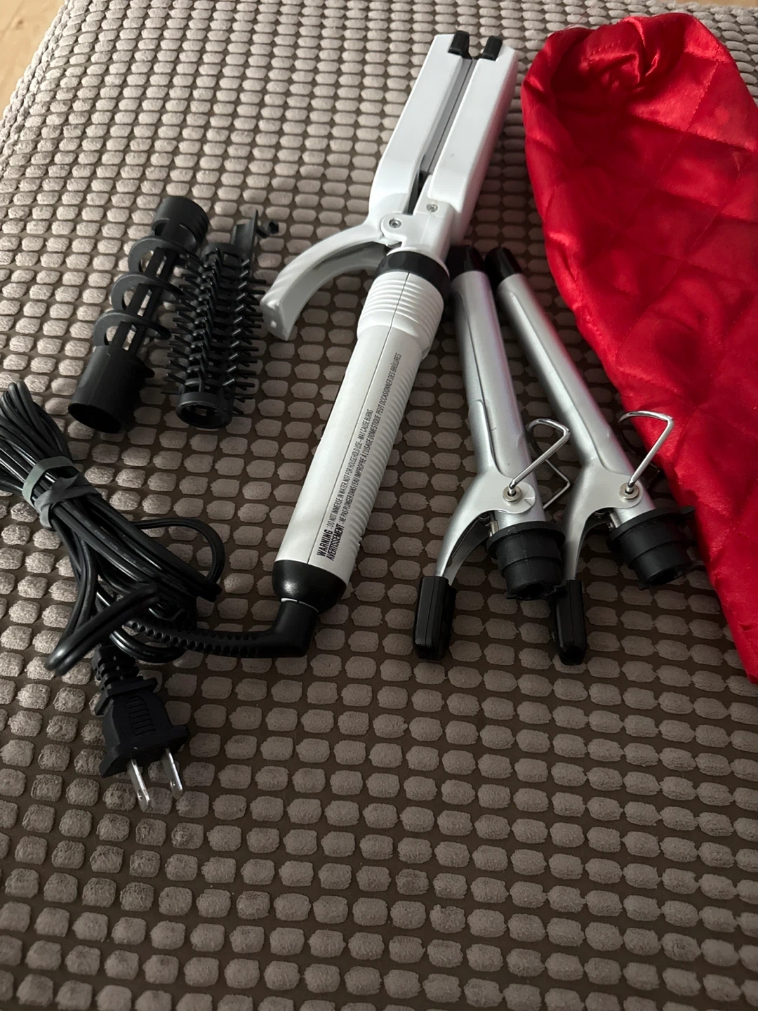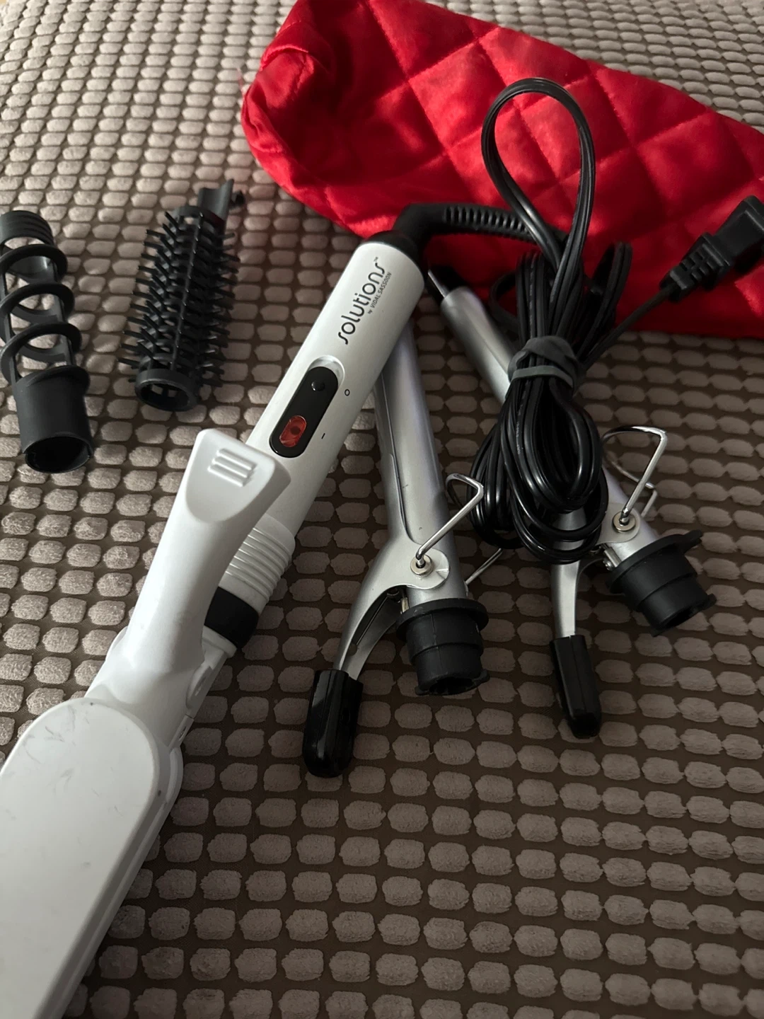 Selling a Solutions hair curling iron set. It comes with multiple attachments for different types of curls. Includes a red storage bag to keep everything organized. Great for experimenting with different hairstyles!