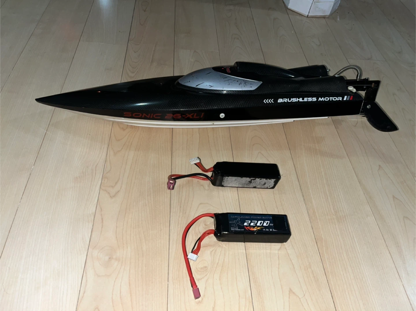 Selling a Sonic 26-XLI brushless RC boat. It features a sleek design and powerful brushless motor for high-speed performance. Comes with two batteries to keep you out on the water longer! Comes with upgraded polish, chrome propeller, high torque
