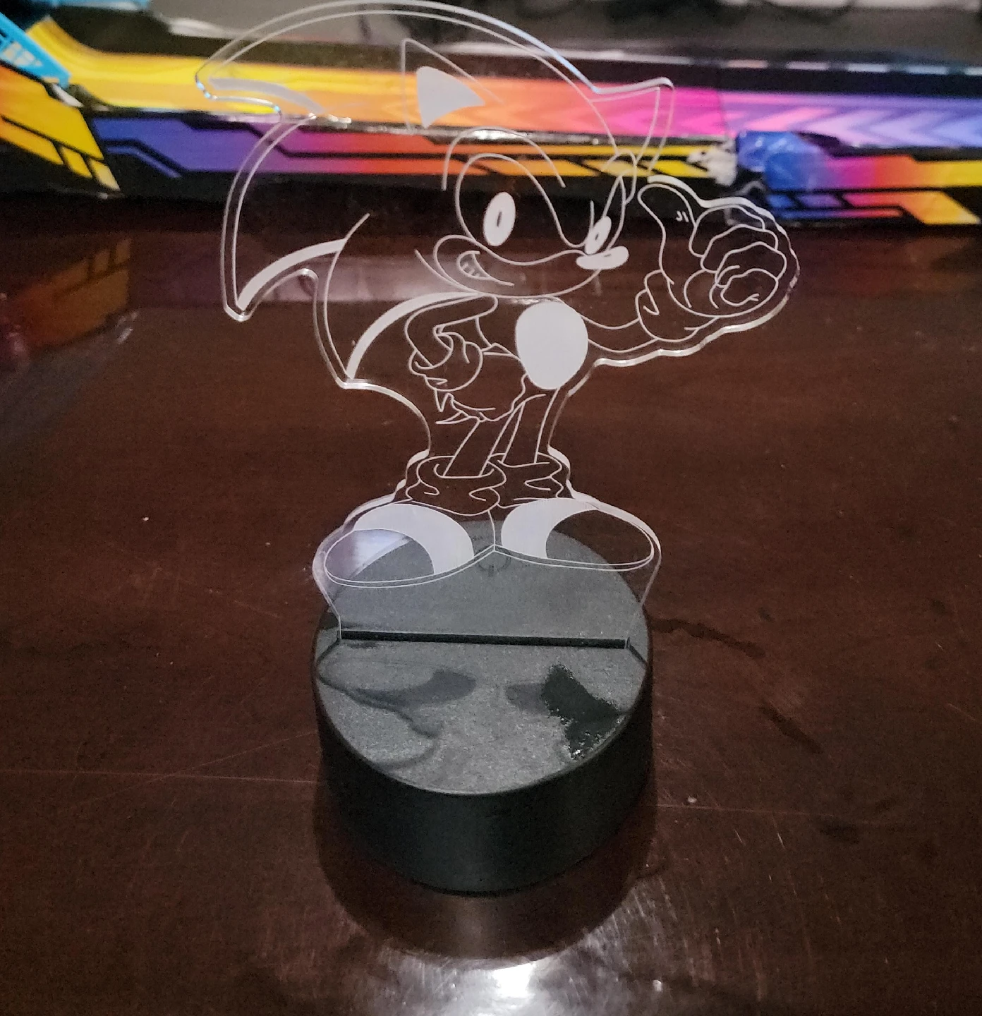 10Check out this cool Sonic the Hedgehog 3D LED lamp! It's in great shape and would look awesome in a game room or bedroom. It features a clear acrylic design of Sonic giving a thumbs up, set on a black base. A fun piece for any Sonic fan!
