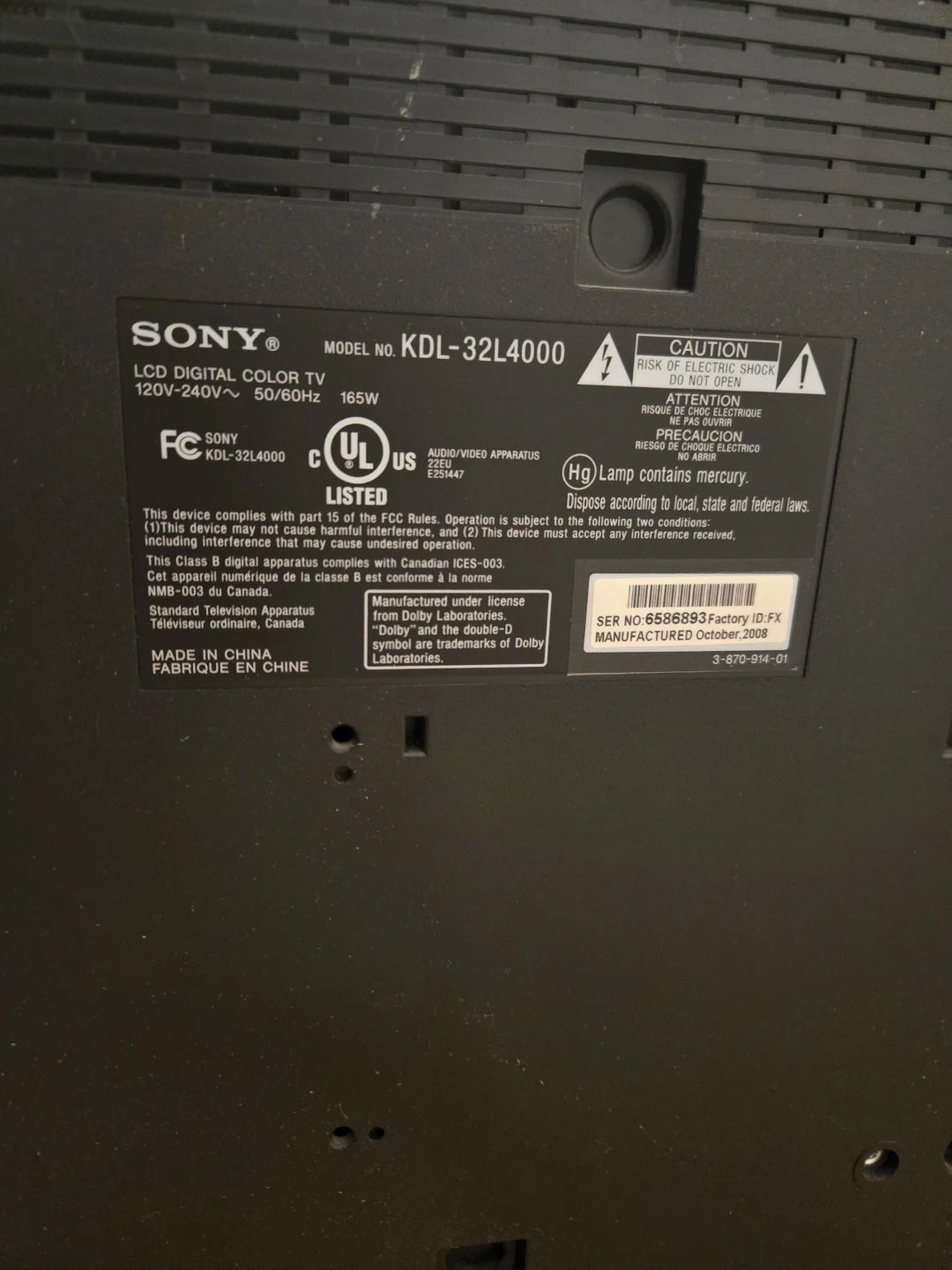 76Selling a Sony Bravia 32-inch LCD TV. It's a model KDL-32L4000. Manufactured October 2008. It has multiple input options including HDMI, PC, Component, and Video. Comes with a remote as well