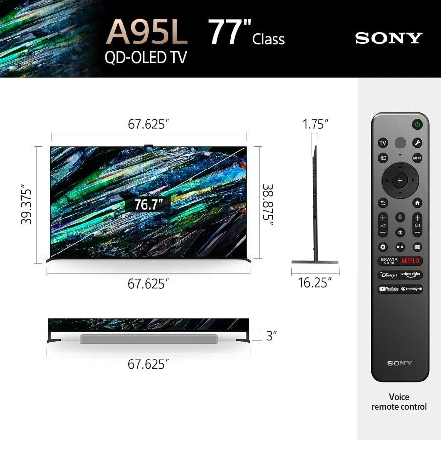 60Selling a Sony Bravia XR A95L 77" Class QD-OLED TV. It measures 67.625" x 39.375" and is 1.75" thick. The TV comes with a voice remote control.