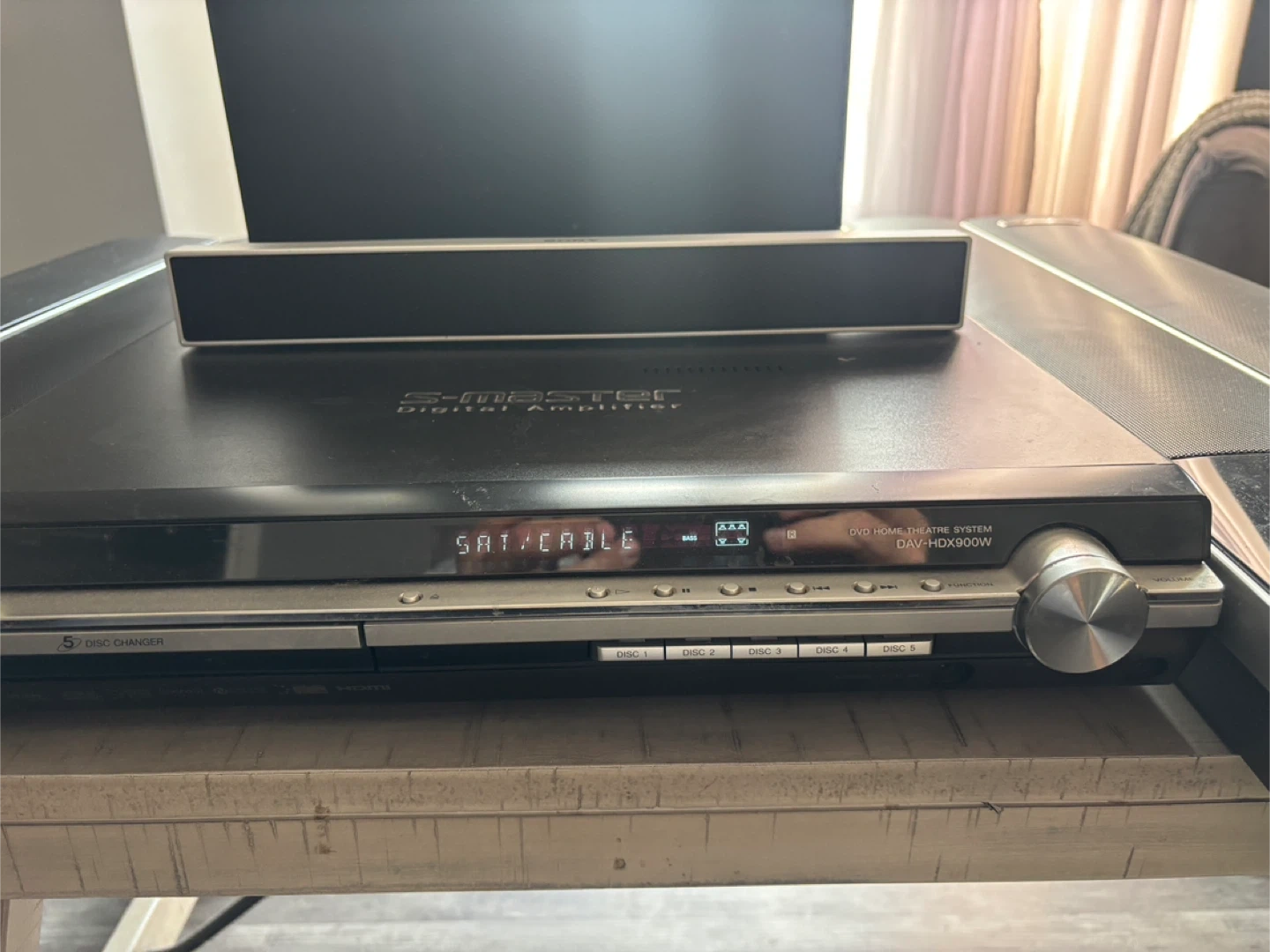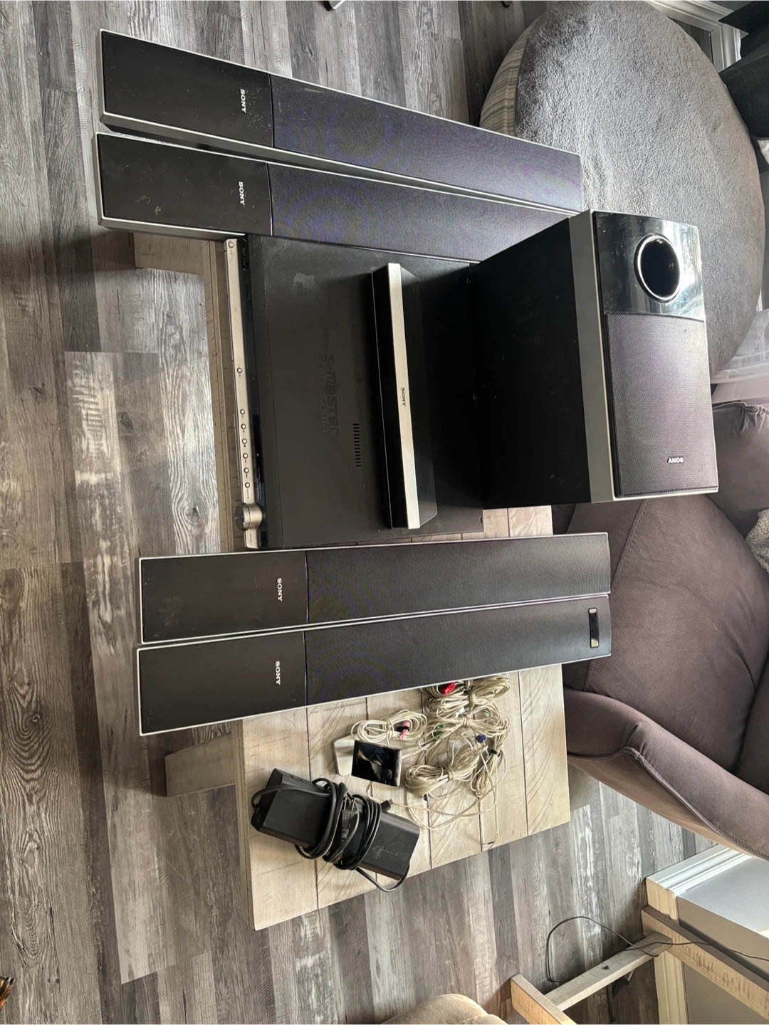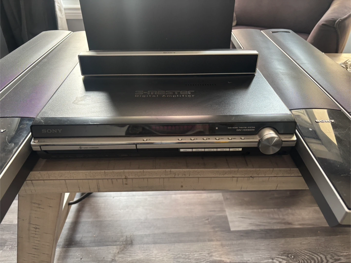 10Selling a Sony DVD Home Theatre System . It features an Digital Amplifier and a 5-disc changer. Includes the 6 speakers and subwoofer as pictured! The rear speakers are wireless from main unit
