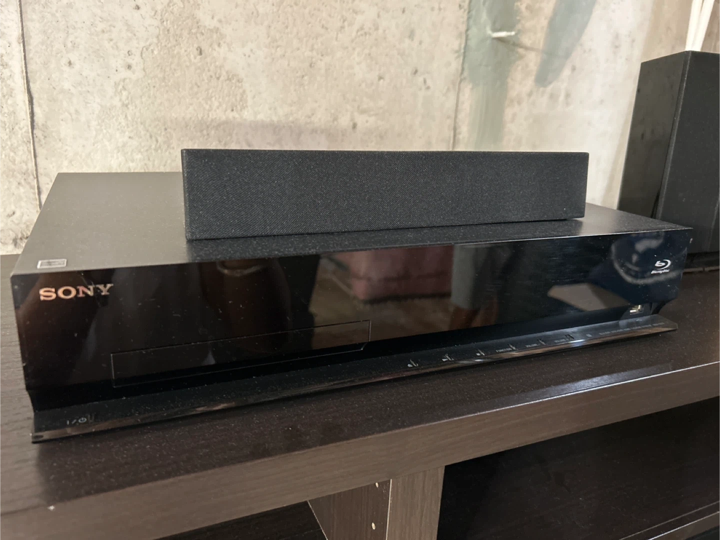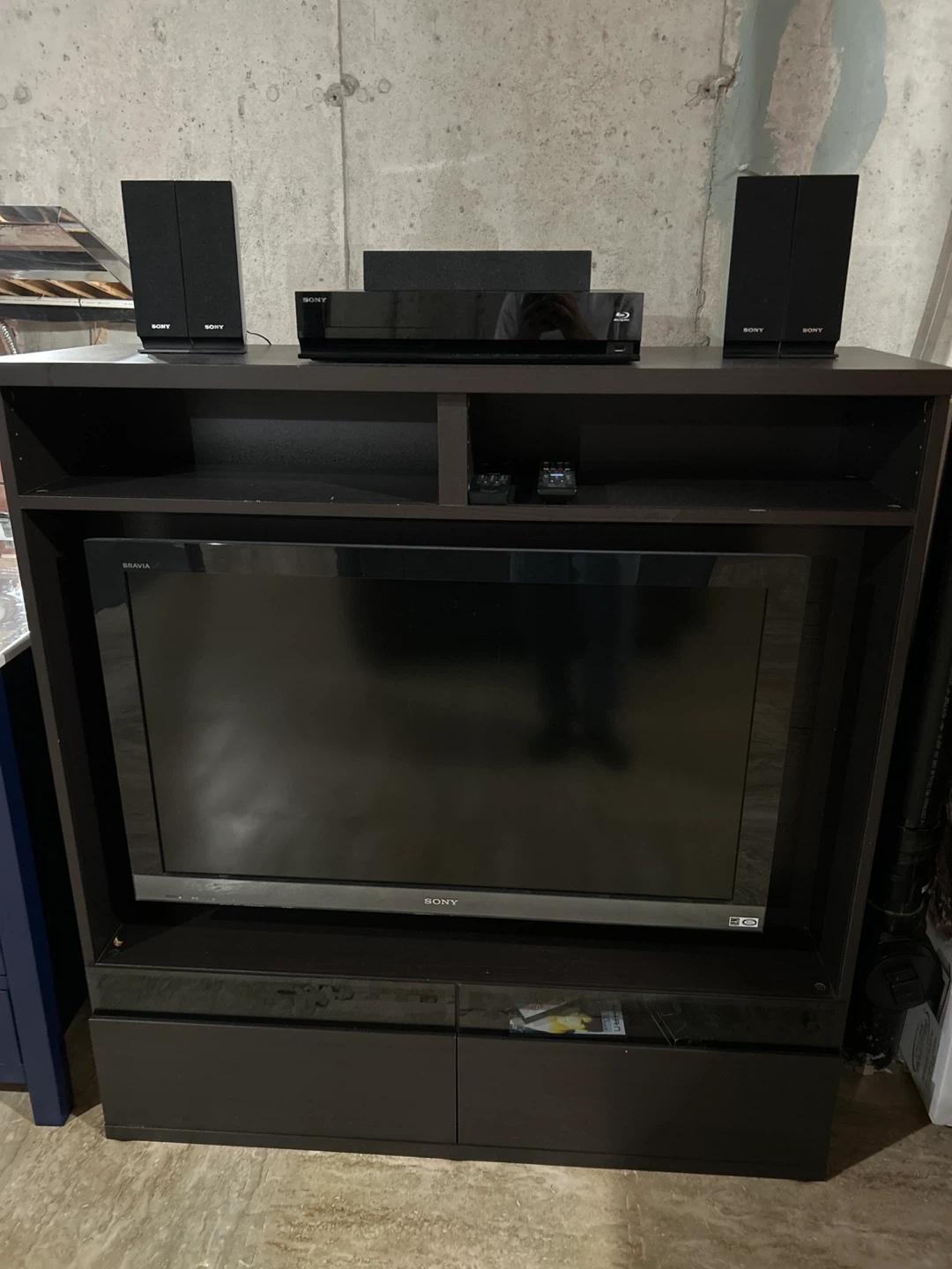Sony LCD Ultra-HD TV with ikea tv stand/dresser with 6 speakers and blue-ray system. Remotes included