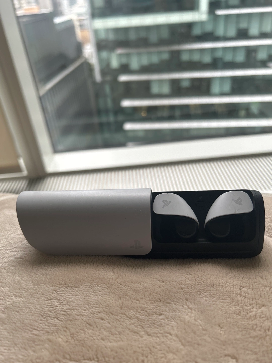 Wireless earbuds with charging case. Good condition. Includes earbuds and case. USB-C charging port. Different ear tips. The left earbud’s audio is not working but you can speak through it. Sold my PS5, so selling these as well.