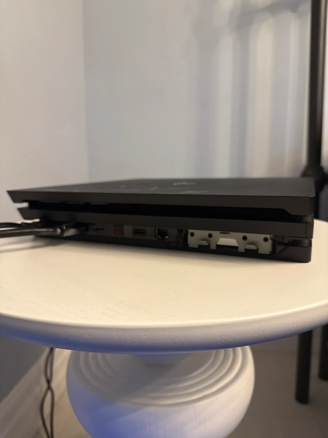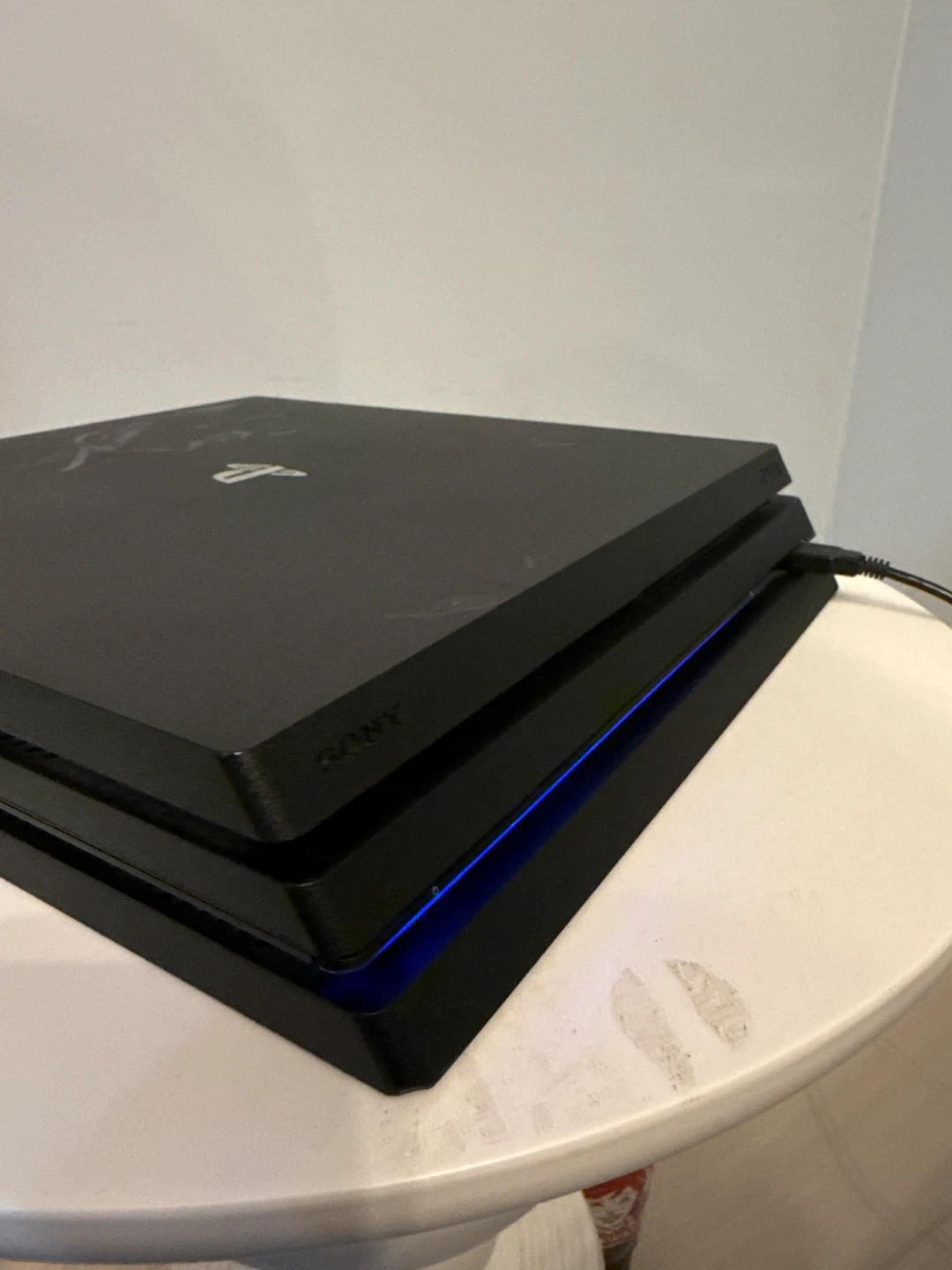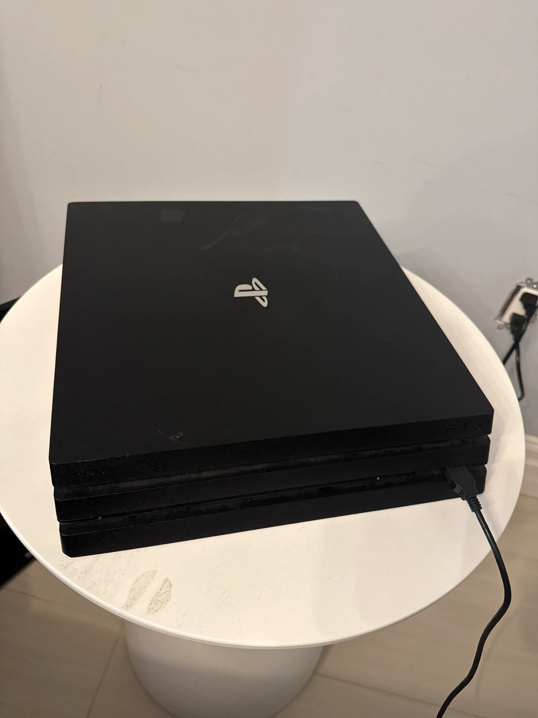 Selling a used PlayStation 4 Pro console in black. It's in good working condition. There are some signs of wear on the top surface.