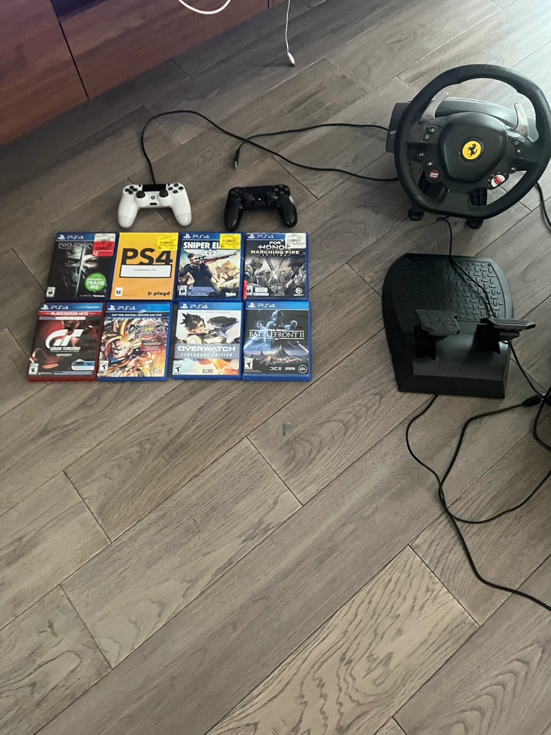 15PS4 Pro 1 TB - Used but good condition 2 Controllers - Used 8 Games - All used except Gran Turismo Steering Wheel - Good Condition Value $1000!!!