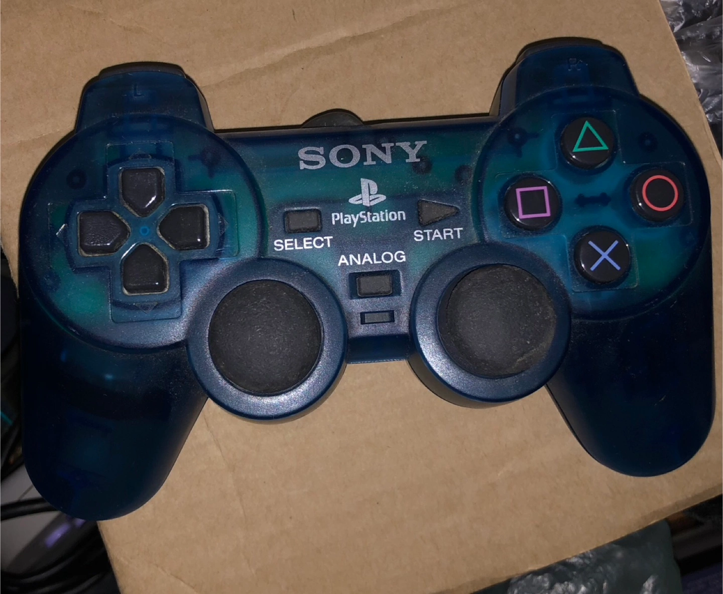 Selling a used blue Sony PlayStation controller. It has some signs of wear, but it's still functional. Perfect for retro gaming!