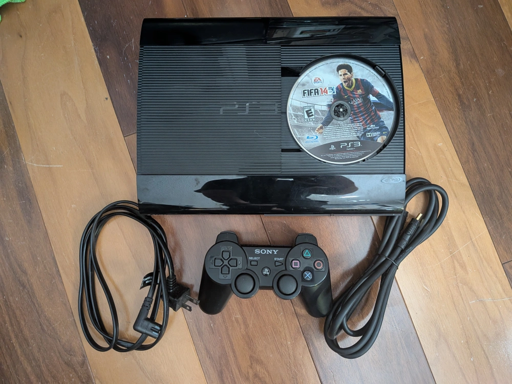 459This is in really good condition, barely looks used at all. Disc drive works, game shown is included. Also includes the power cord, HDMI cord, and a DualShock 3 Controller. Hard drive is 250GB.