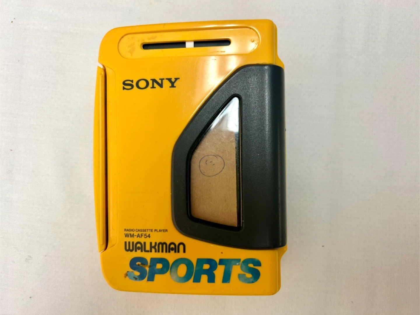 123Selling a vintage Sony Walkman Sports WM-AF54 in yellow! It's a cool retro cassette player. Includes a Panasonic battery to get you started. Perfect for anyone who loves the classic Walkman look and wants to enjoy their old cassette tapes. It works but I can’t figure out how to get the sound to come out! Price is firm