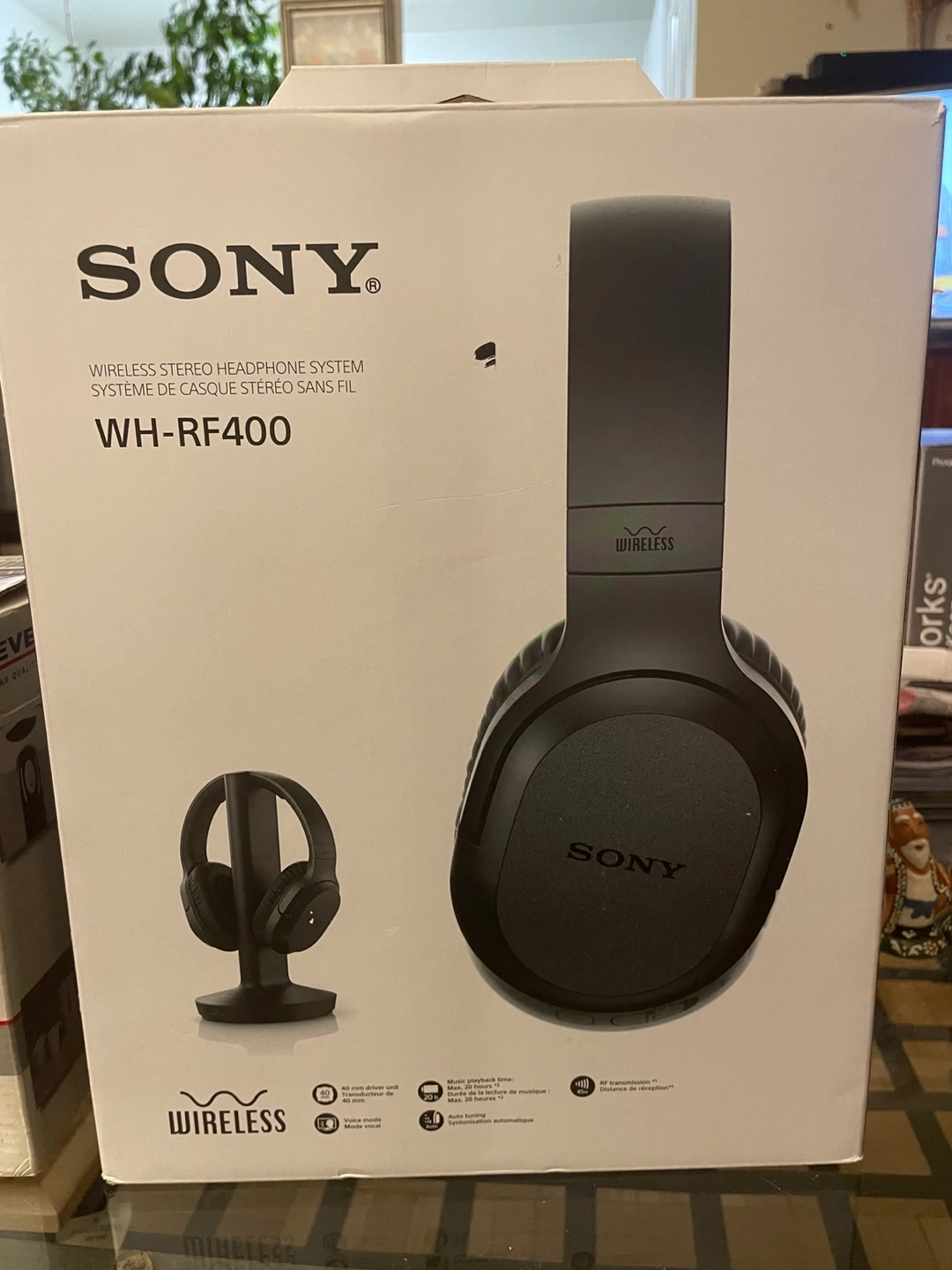 New Sony WH-RF400 stereo headphones in the original box, transmitter dock for charging is included. These headphones are NOT Bluetooth, they are perfect for TV, home theatre and gaming.