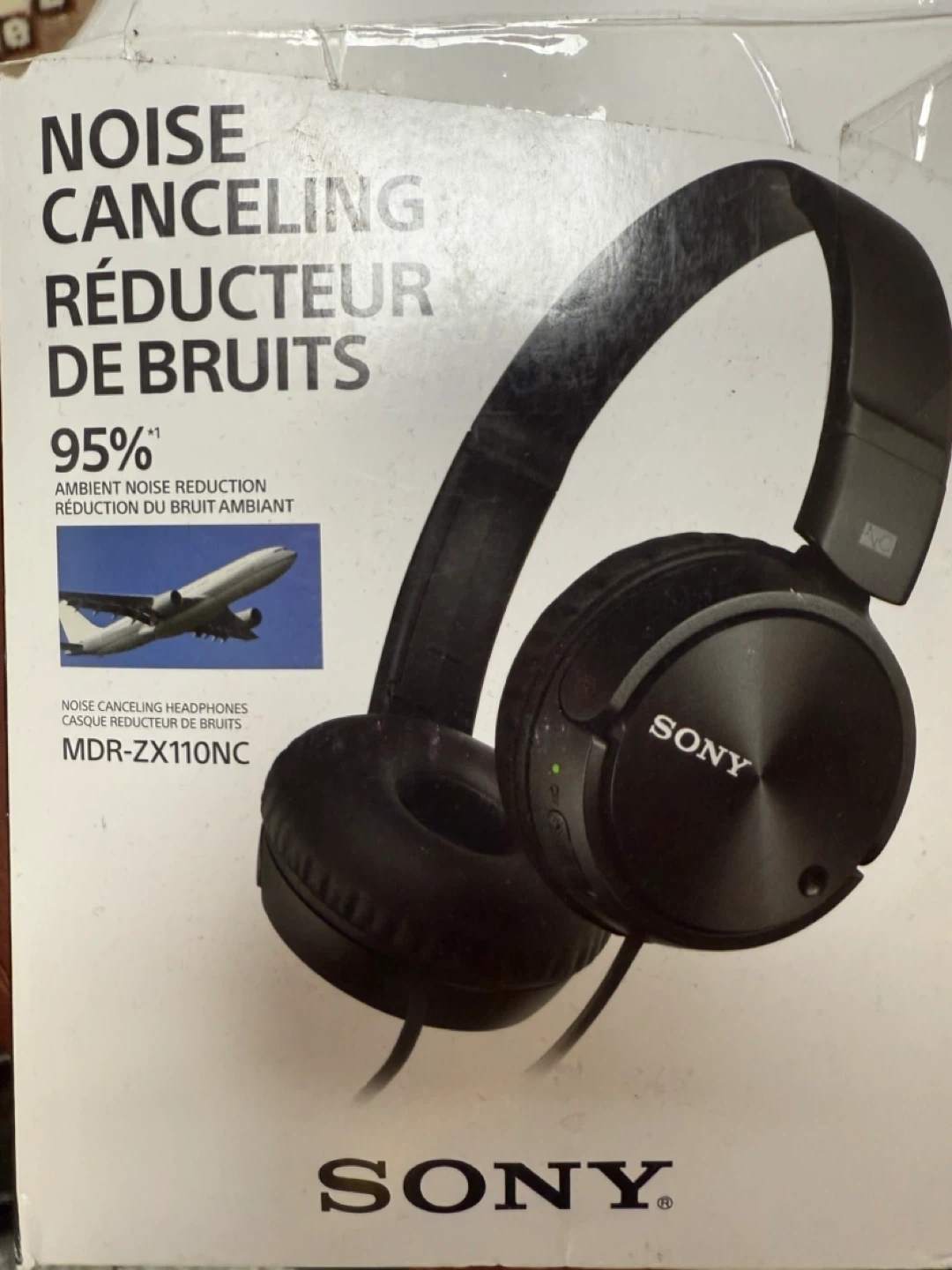 Never used Sony noise cancelling headphones. Retails for 54.99 plus tax, pickup only and price is negotiable. Comes with original box and replacement battery Model MDRZX110NC