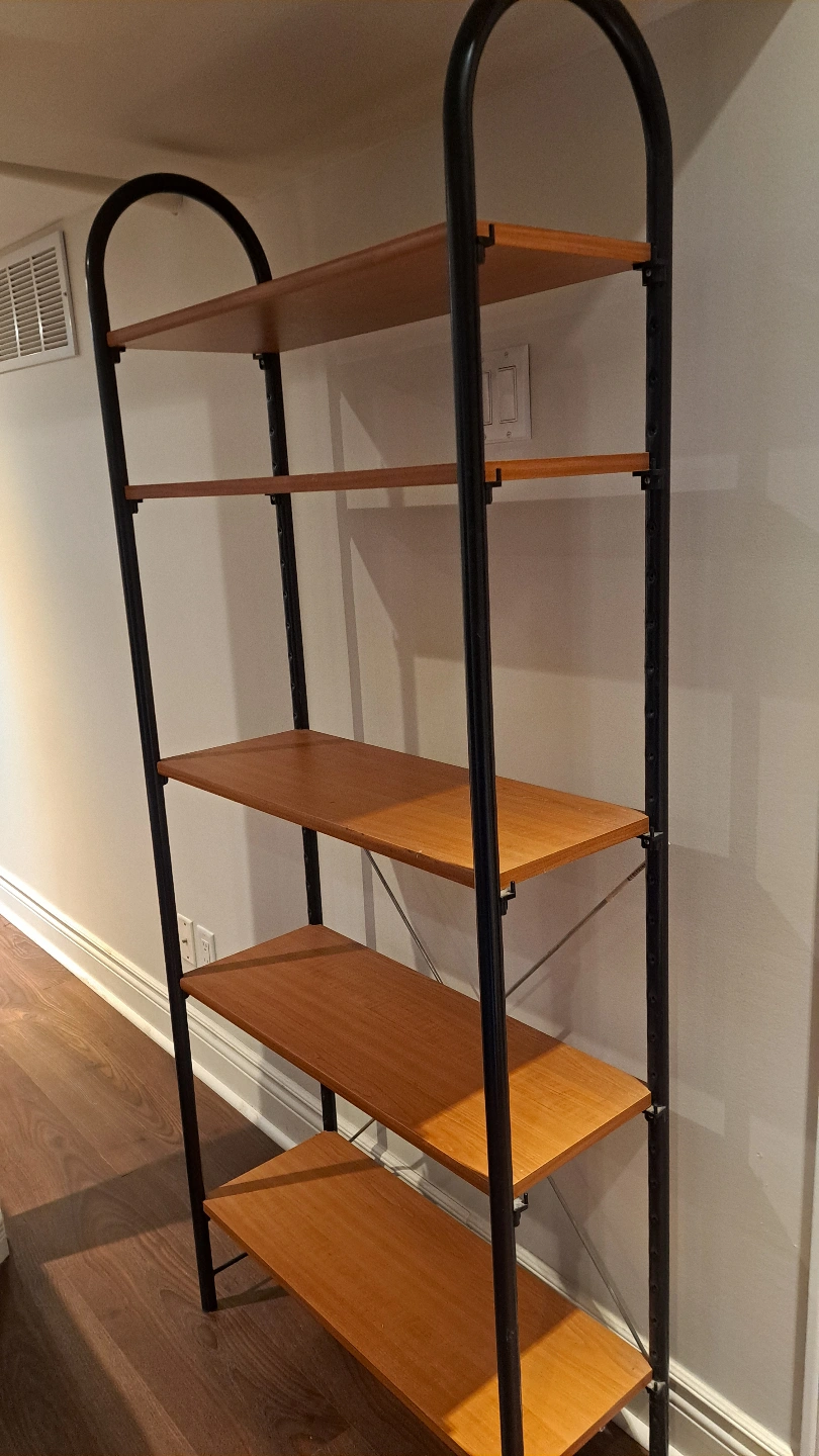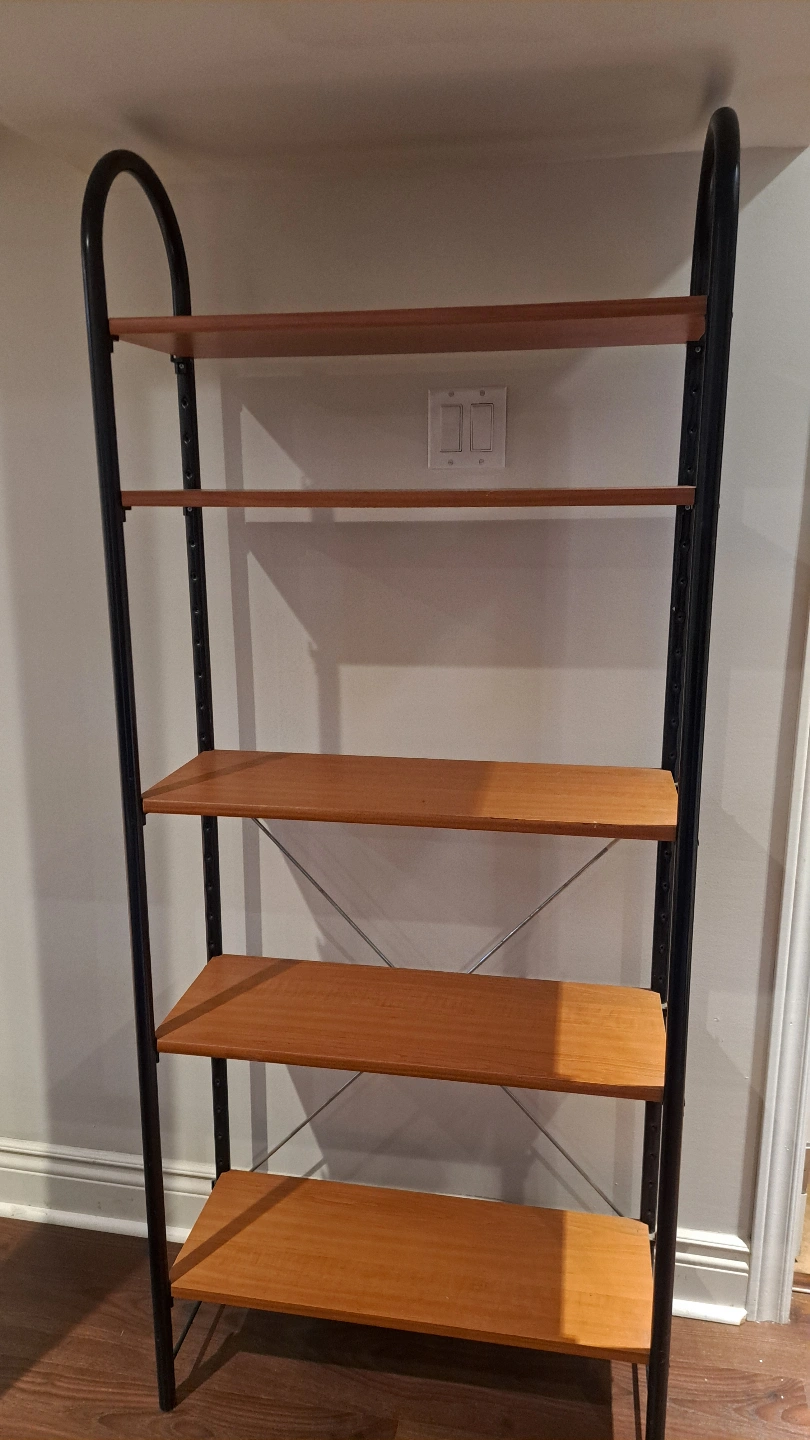 Tall, free-standing shelving unit. Five shelves, light brown wood. Black metal frame. Arched top. Great for storage.