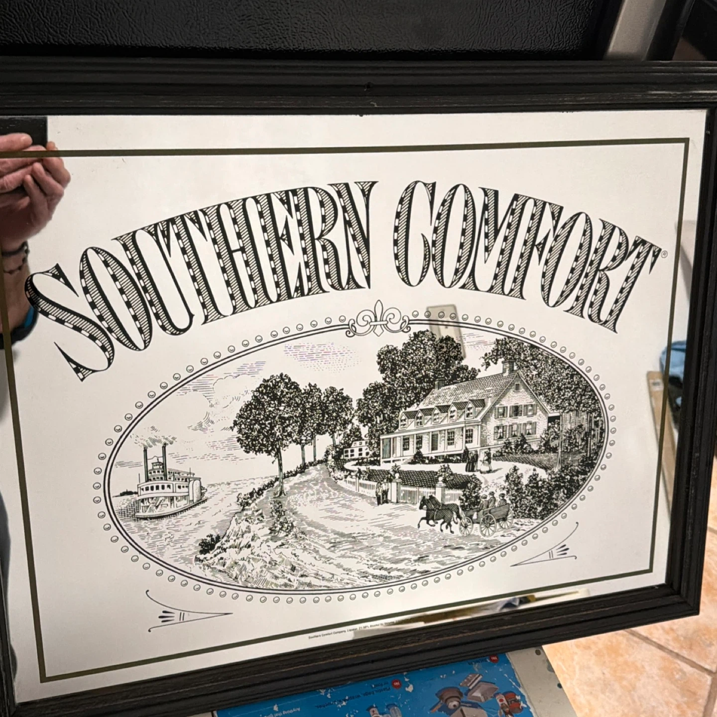 Vintage Southern Comfort mirror. Features a black wooden frame with decorative ribbed detailing. The mirror displays a classic scene with a steamboat on a river and a large house. It's a great decorative piece for any bar or man cave!