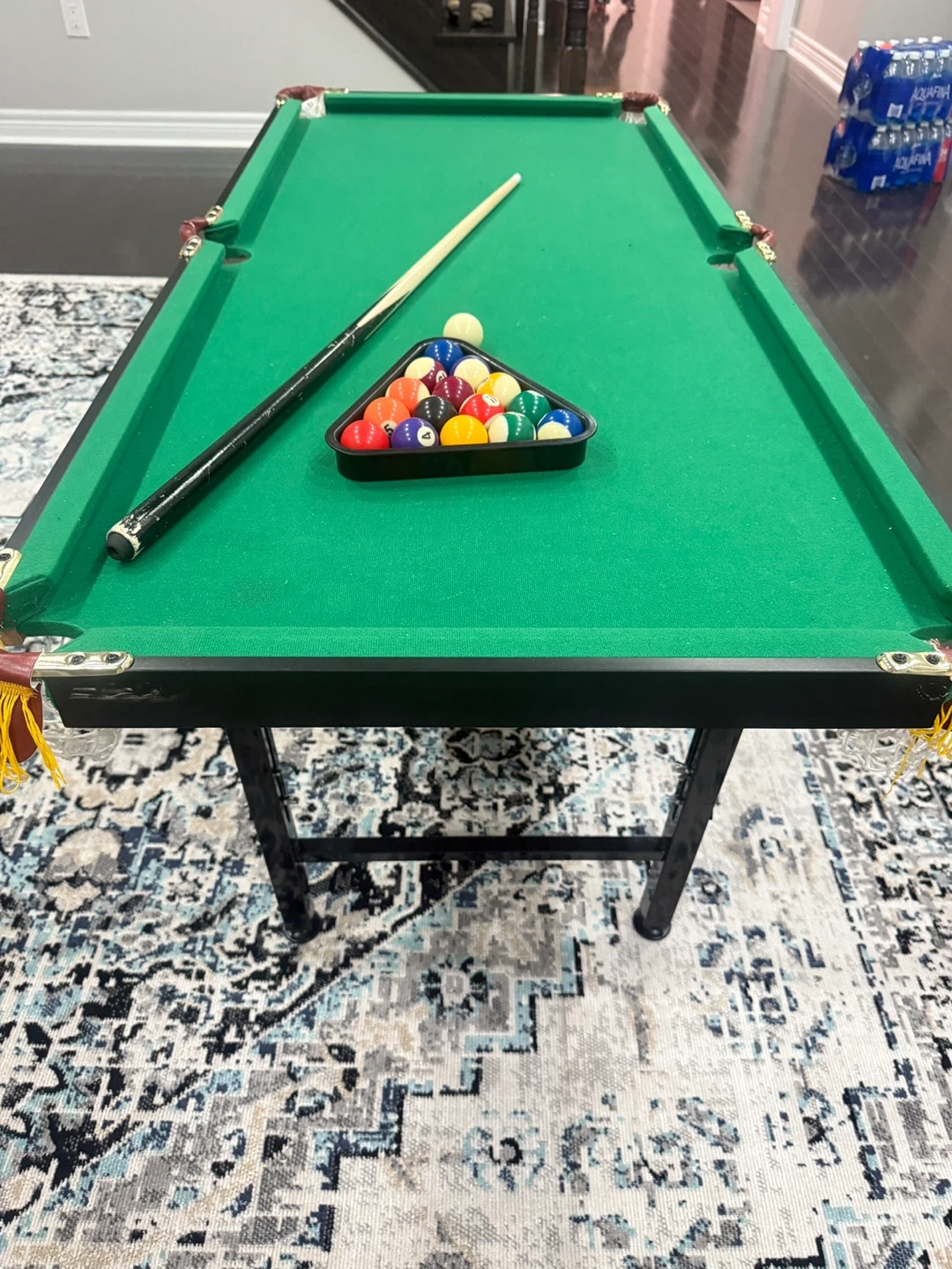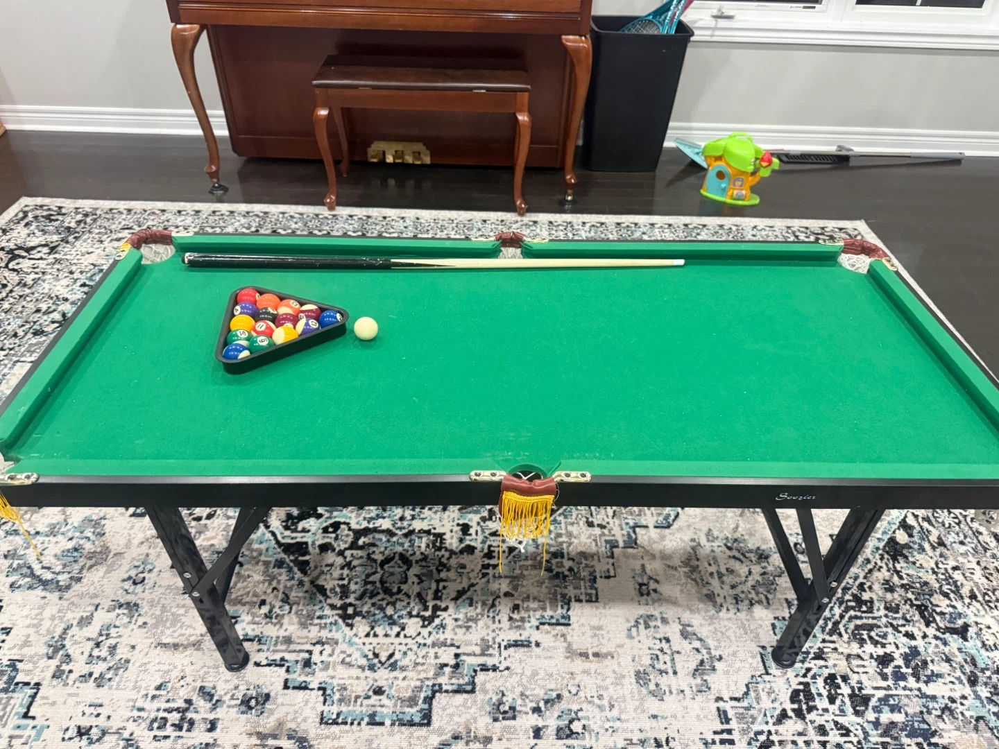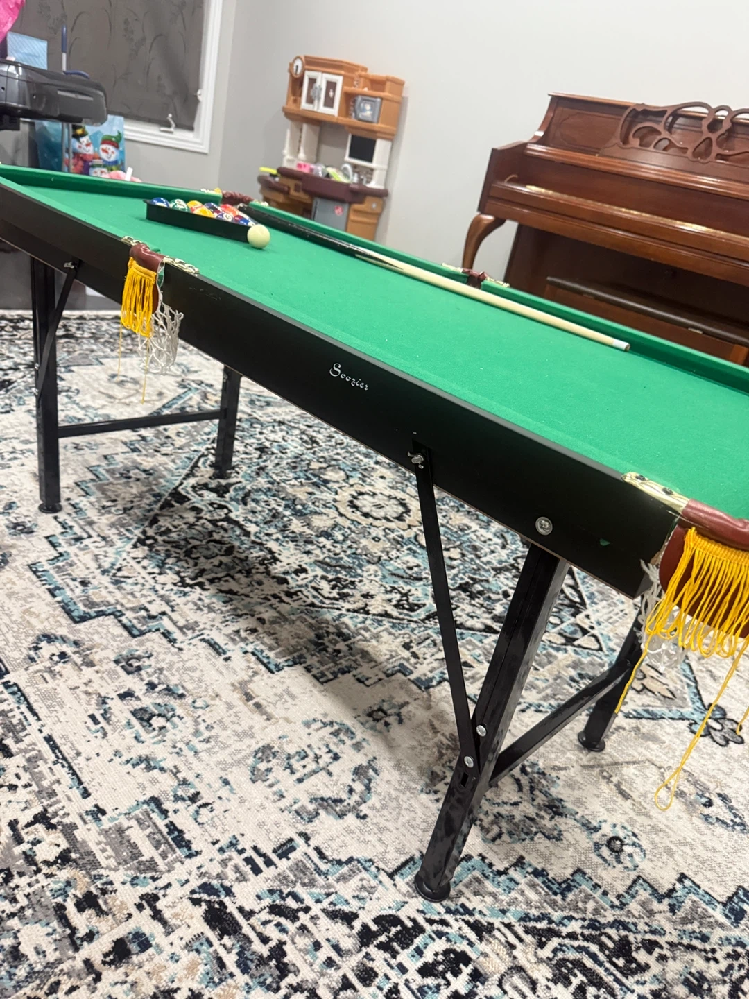 33Selling a Soozier folding adjustable pool table! It's in great shape and perfect for smaller spaces since it can be easily folded and stored away when not in use. Comes with all the accessories you need to start playing, including the cue stick and balls