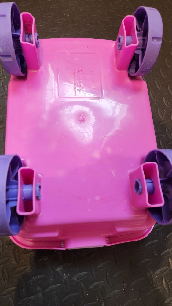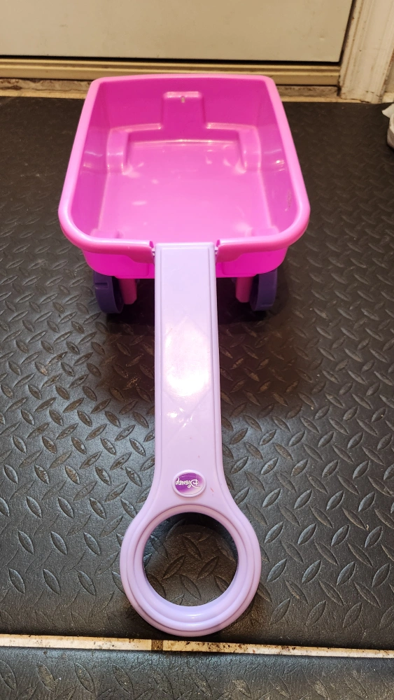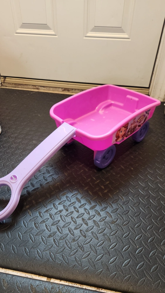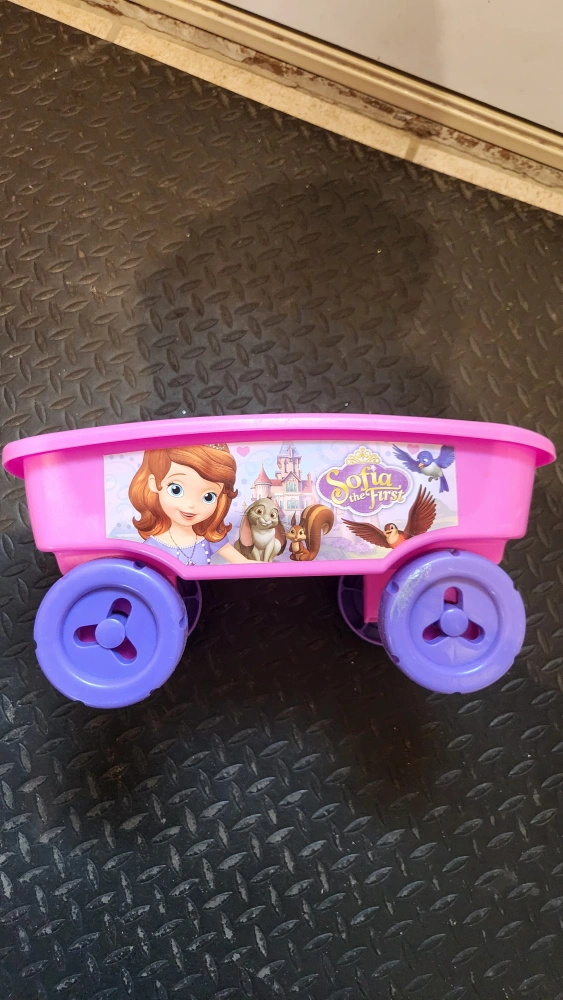 Pink wagon with purple wheels and handle. Features a Sophia the First design.