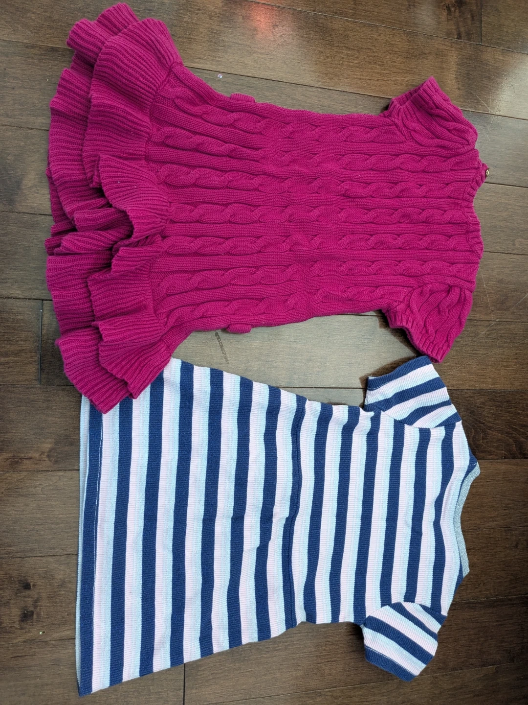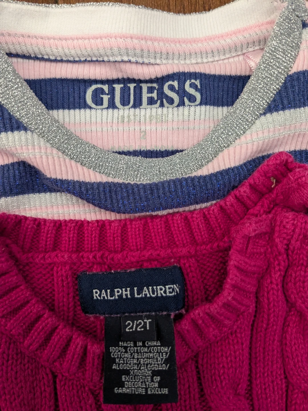 A pink cable-knit Ralph Lauren dress with ruffle details and a blue and white striped Guess dress. Both are size 2/2T. The Ralph Lauren dress is made of 100% cotton.