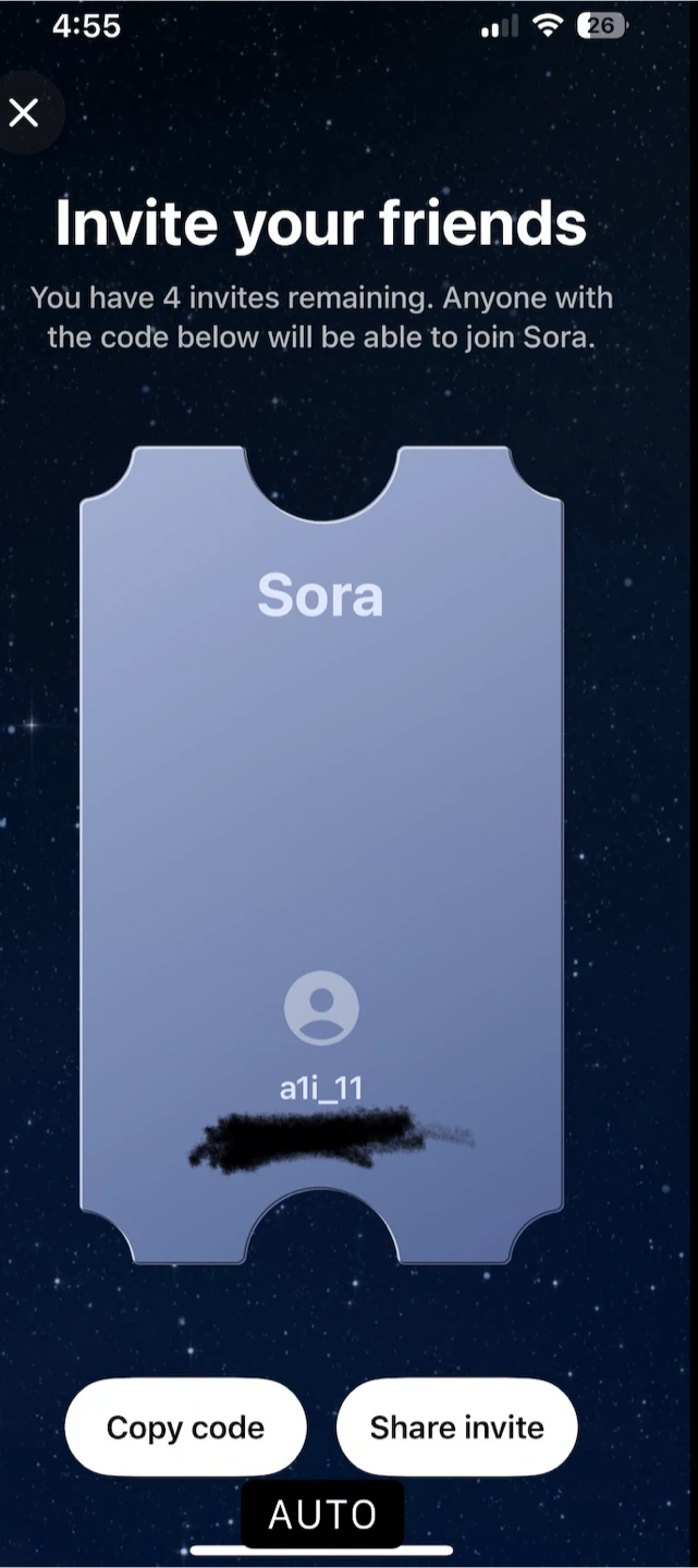 I have 4 invites remaining for Sora! Anyone with the code can join. Copy the code and share the invite!