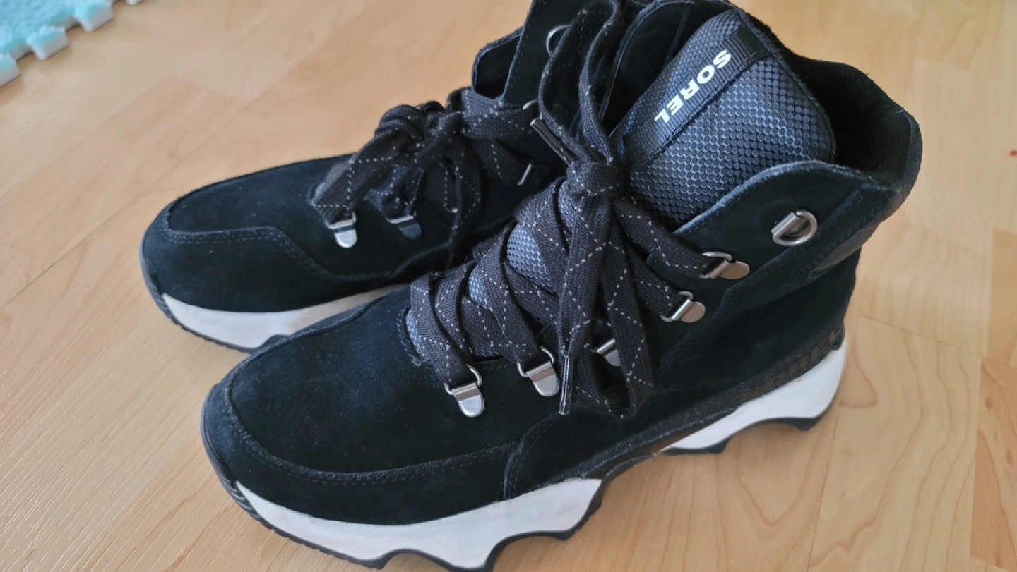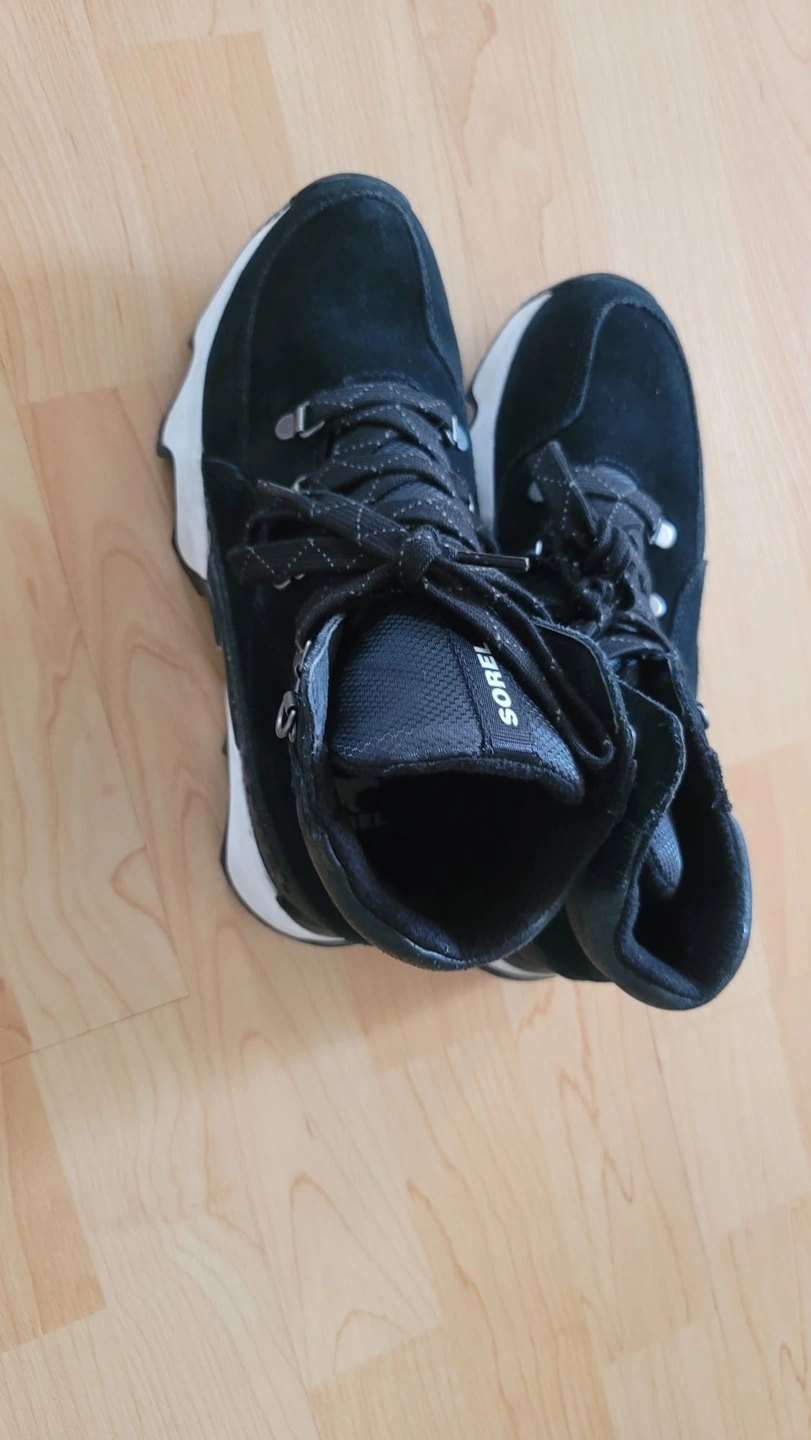 16Black suede high-top boots. Lace-up closure. Thick white sole. Excellent for fall and winter.