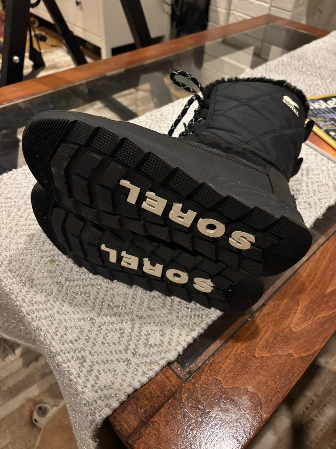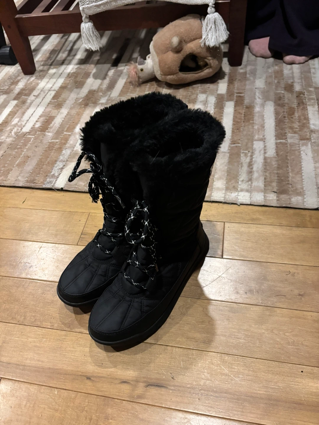 60Selling a pair of Sorel winter boots in black. They are in great condition and perfect for keeping your feet warm and dry during the winter months. They feature a quilted design and faux fur trim. Worn only a couple of times, we bought too small.