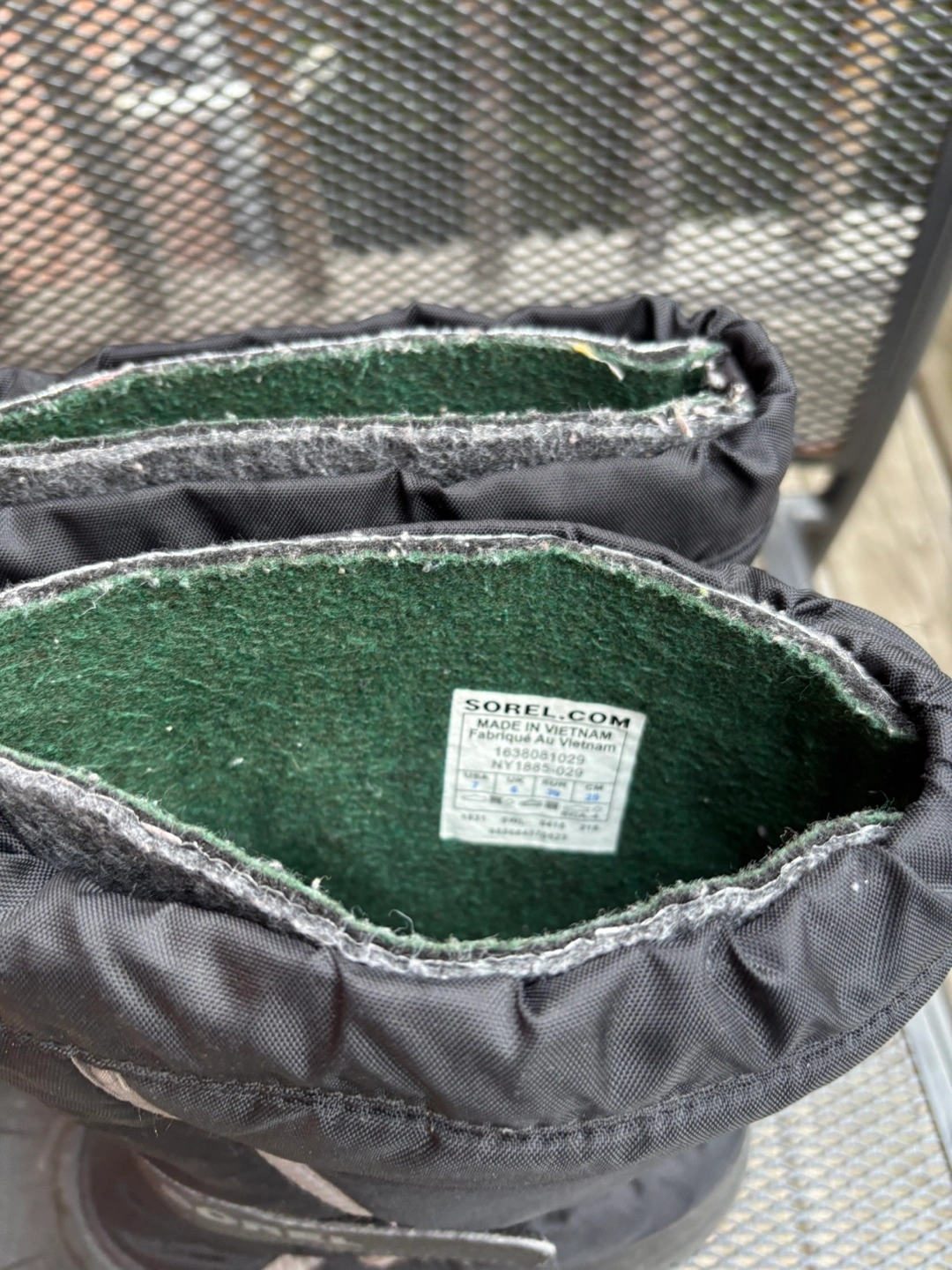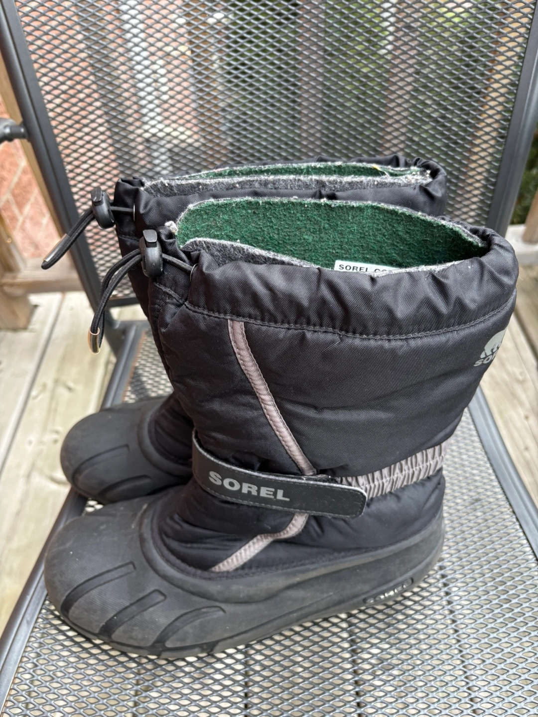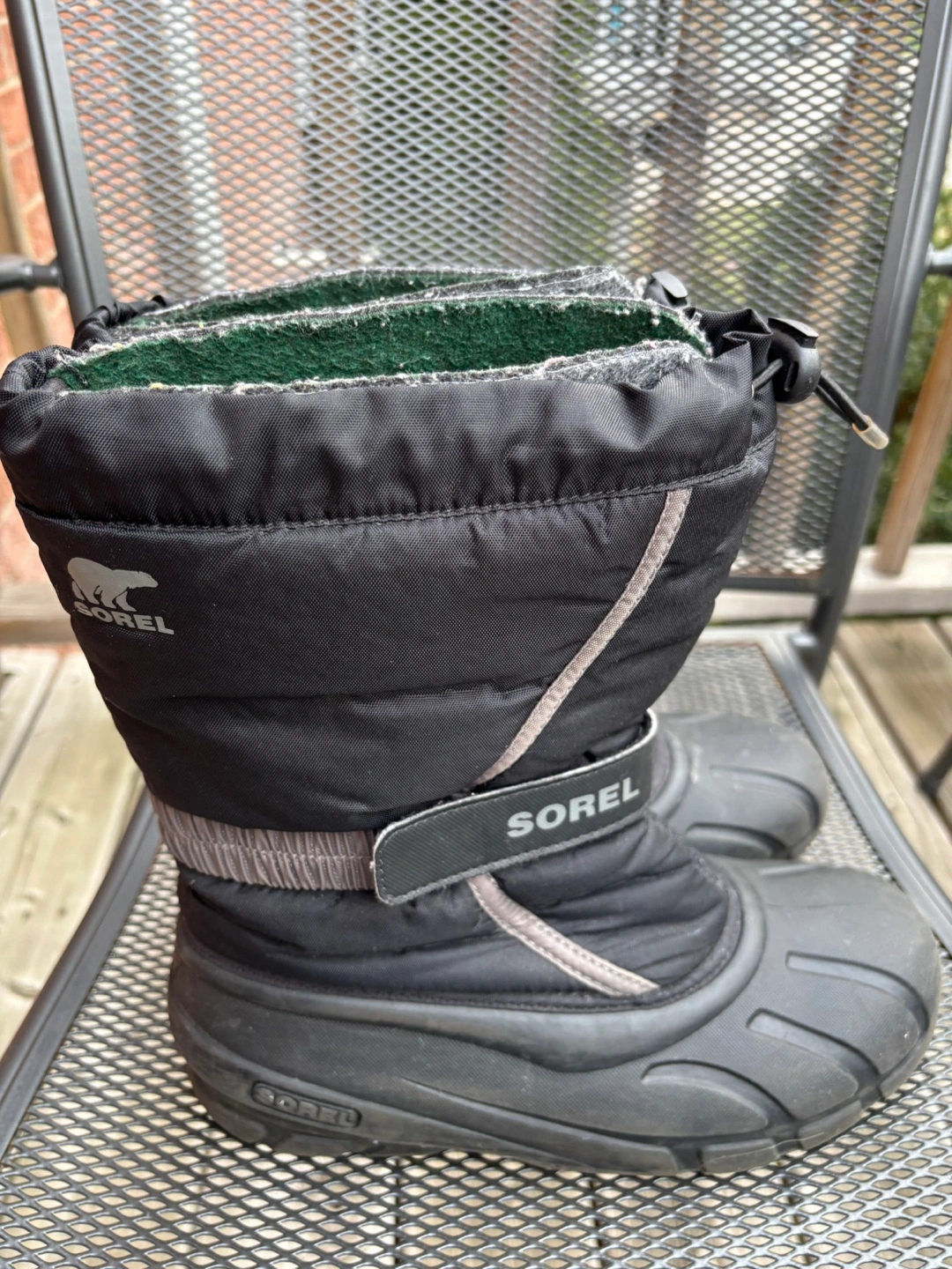 10Black winter boots with grey accents and a green fleece lining. The boots have a velcro strap and a drawstring. Size 7